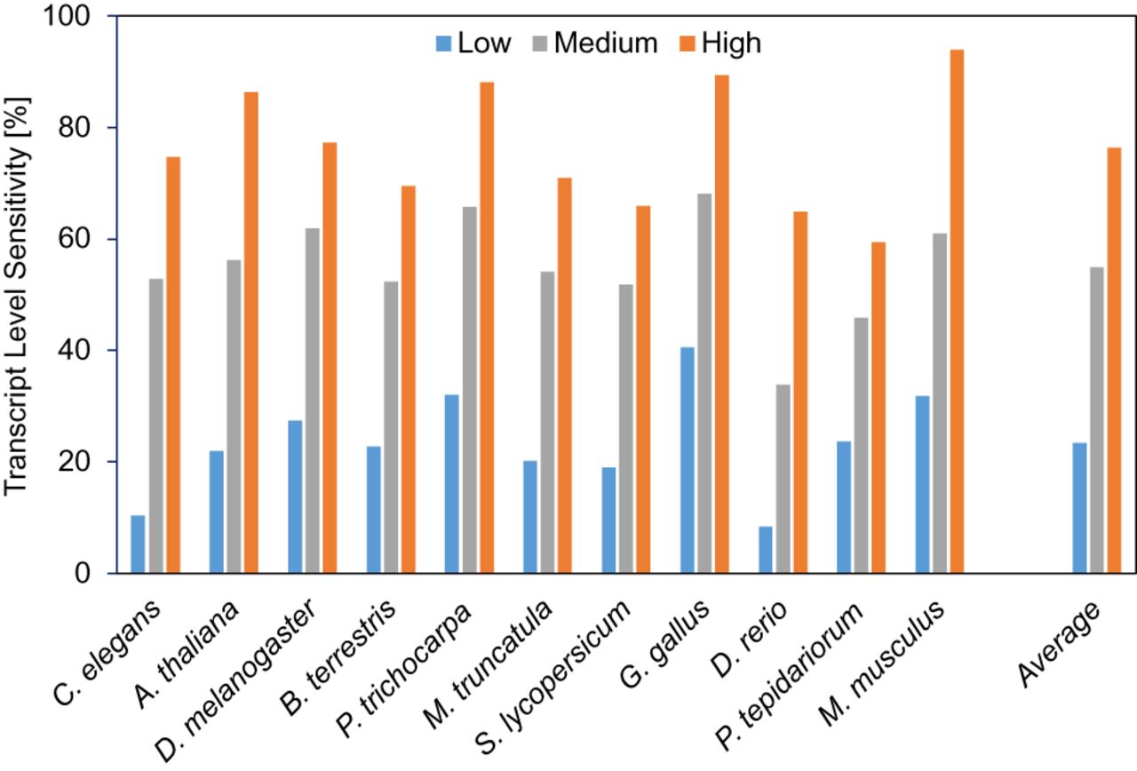 Lowly, medium, and highly expressed transcripts are in the first, second, and third terciles of expression levels, respectively.