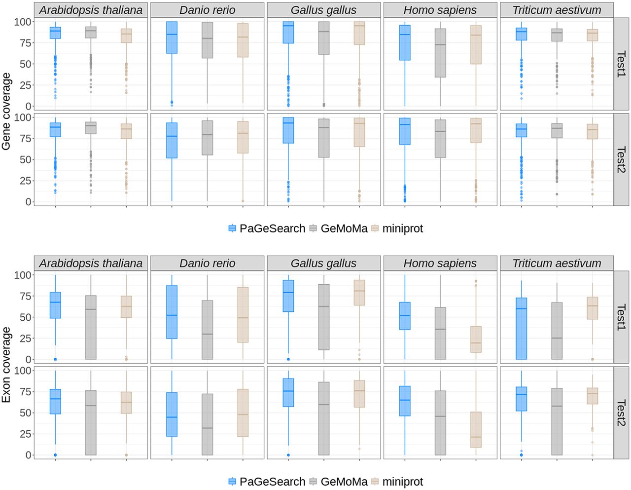 The distributions of gene and exon coverages for true-positive regions, as identified by PaGeSearch, GeMoMa, and miniprot, categorized by archetype species and the test species used for validation.