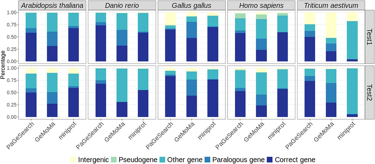 The percentage of annotations of regions identified in PaGeSearch, GeMoMa, and miniprot categorized by archetype species and the species used for validation. “Correct genes” are regions that overlap with the regions of the query genes; “paralogous genes” are regions that overlap with paralogs of the query genes; “other genes” are regions that overlap with protein-coding genes that are neither correct genes nor paralogs of the query genes; “pseudogenes” are regions that overlap with pseudogenes; and “intergenic” are regions that do not overlap with any genes.