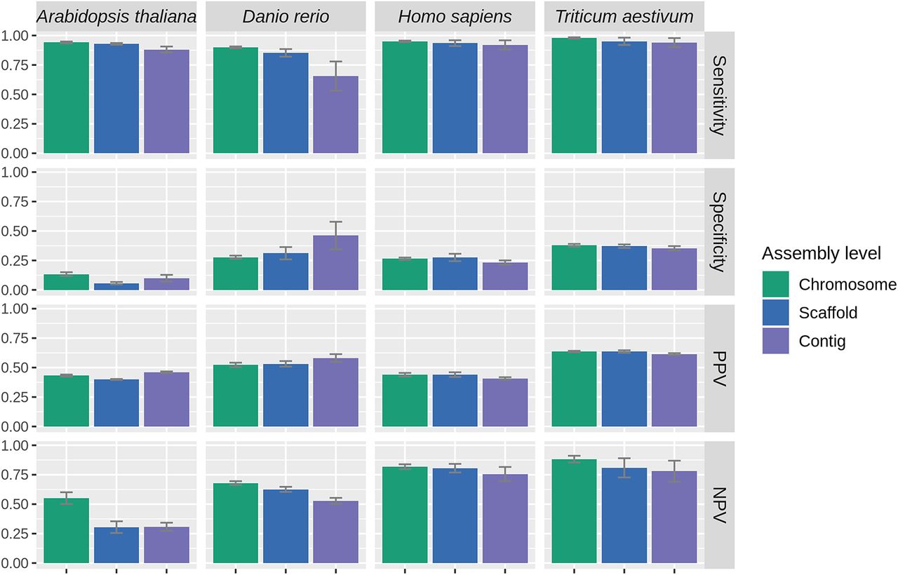 The sensitivity, specificity, PPV, and NPV of PaGeSearch tested on chromosome-level, scaffold-level, and contig-level assemblies.