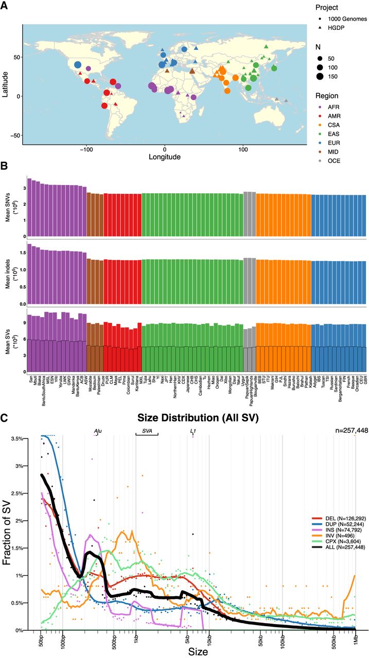 Geographical locations and genetic variants across populations. (A) Global map indicating approximate geographical locations where samples were collected. Coordinates were included for each population originating from the Geography of Genetic Variants browser as well as metadata from the HGDP (Marcus and Novembre 2017; Bergström et al. 2020). (B) Mean number of SNVs (top panel), indels (middle panel), and SVs (bottom panel) per individual within each population. The bottom panel showing SVs has a set of outlined bars in black that counts the subset of SVs called outside of highly repetitive genomic regions, which decreases calling accuracy in short-read sequencing data (Zhao et al. 2021). The bars without the outline indicate total SV counts regardless of whether they span repetitive regions. (A,B) Colors are consistent with geographical/genetic regions as follows: (AFR) African, (AMR) admixed American, (CSA) Central/South Asian, (EAS) East Asian, (EUR) European, (MID) Middle Eastern, and (OCE) Oceanian. (C) Sizes of SVs decay in frequency with increasing size overall with notable exceptions of mobile elements, including Alu, SVA, and LINE-1. (DEL) Deletion, (DUP) duplication, (CNV) copy number variant, (INS) insertion, (INV) inversion, and (CPX) complex rearrangement.