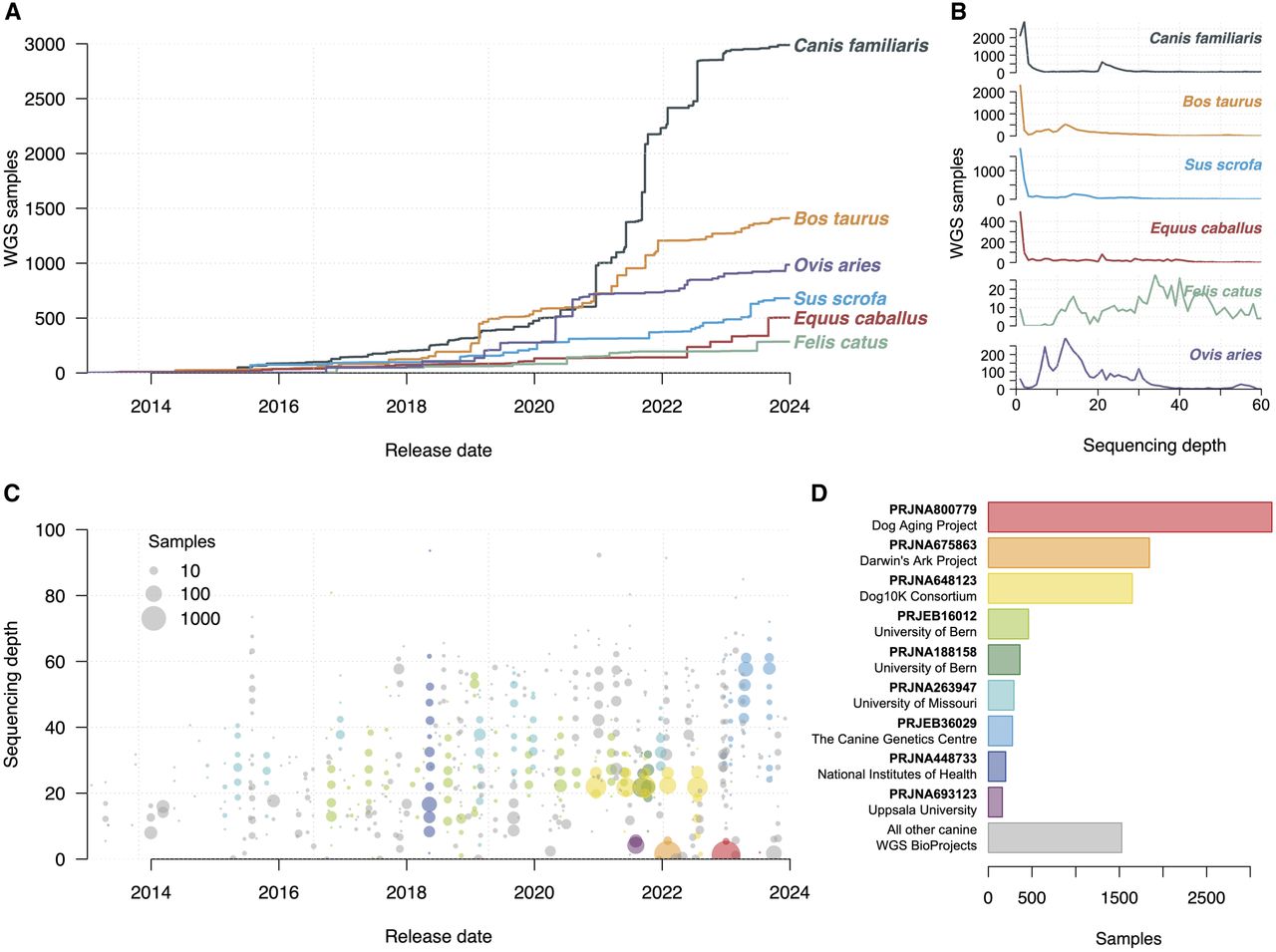 Illumina whole-genome sequences (WGSs) publicly released by animal genomics communities. (A) Number of samples per species sequenced at depths between 20× and 40×. (B) Distribution of sequencing depths for six different domestic mammalian species. (C) Public release of canine WGS Illumina data from 2013 to 2024 on the NCBI Sequence Read Archive (SRA). Size of the data points represents the number of samples released within a yearly quarter at a similar sequencing depth. Points are colored according to their listed NCBI BioProject in D. (D) The total number of samples released for the nine largest canine WGS BioProjects.