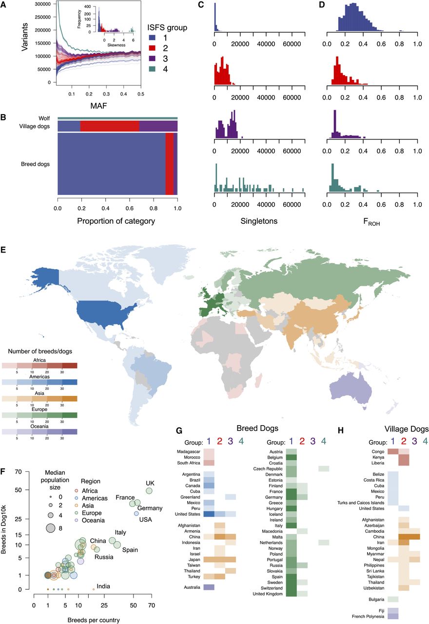 (See following page for legend.) Genetic diversity of dog breeds represented within Dog10K. (A) Individual site frequency spectrum (ISFS) from the Dog10K data set (Meadows et al. 2023). Each curve represents the number of variants that each dog carries and the MAF of those variants across the Dog10K cohort. Individual dogs were grouped according to the skewness of their ISFS curve. Most of the genetic variation for dogs in ISFS group 1 is common across dog populations, whereas dogs in ISFS group 4 carry a high number of variants that are rare within Dog10K. (B) ISFS group proportions for each Dog10K sample category (wolf, village dogs, or breed dogs). Height of the horizontal bars is proportional to the number of Dog10K dogs belonging to each category. (C) Distribution of singleton variants per individual, plotted according to ISFS group. (D) Degree of inbreeding for each dog depicted as the fraction of the genome within runs of homozygosity, plotted according to ISFS group. (E) Global distribution of dog breeds. Colors represent global regions, and depth of shading represents the number of breeds originating in each country. (F) Sample collection within the Dog10K Project is representative of global breed diversity. The number of breeds collected was proportional to the number of breeds that originated in each country. The size of the data point indicates the median breed population size collected within Dog10K. Data points are colored according to the global region of breed origin. (G) Number of Dog10K breed dogs per country that belong to each ISFS group depicted in A. Depth of shading in G and H represents the numbers of dogs in each category according to the key shown in E. (H) Number of Dog10K village dogs per country that belong to each ISFS group depicted in A.