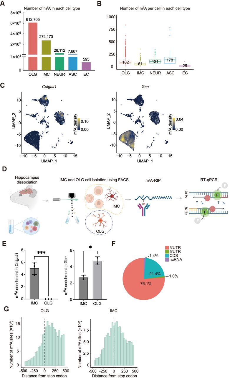 m6A single-cell distribution per mouse hippocampal cell type. (A) m6A counts per cell type. (OLG) oligodendrocyte cell lineage, (IMC) immune cell lineage, (NEUR) neuronal cell lineage, (ASC) astrocyte cell lineage, (EC) endothelial cell lineage. (B) m6A counts per cell for each cell type. Number reflects average. (C) UMAP illustrating the m6A density on RNA transcribed from one gene, per cell. Plots for genes Colgalt1 and Gsn are shown. Legend color represents density of m6A on RNA transcribed. (D) Schematic diagram of approach confirming differential m6A RNA modifications in different cell populations. Relevant cell groups from hippocampi are isolated by FACS sorting, such as IMC versus OLG, followed by m6A RNA immunoprecipitation (m6A-RIP), reverse transcription, and qPCR (RT-qPCR). m6A-RIP enrichment represents relative m6A abundance in different cell populations. (E) m6A transcript enrichment quantifications in IMC and OLG populations following m6A-RIP and RT-qPCR versus input control samples. Transcript m6A enrichments represent m6A abundance in IMC and OLG cells. Both transcripts of Colgalt1 and Gsn were detected in all input control samples. No Colgalt1 transcripts were detected following m6A-RIP in OLG. Unpaired t-test (two-tailed) was used to test the difference between OLG compared with IMC. (***) P ≤ 0.001, (*) P ≤ 0.05. (F) m6A distribution within RNA. Data represent pooled single-cell data. (CDS) coding site, (ncRNA) noncoding RNA. (G) m6A distribution surrounding the stop codon (0 nt) identified by single-cell sequencing for OLG and IMC.