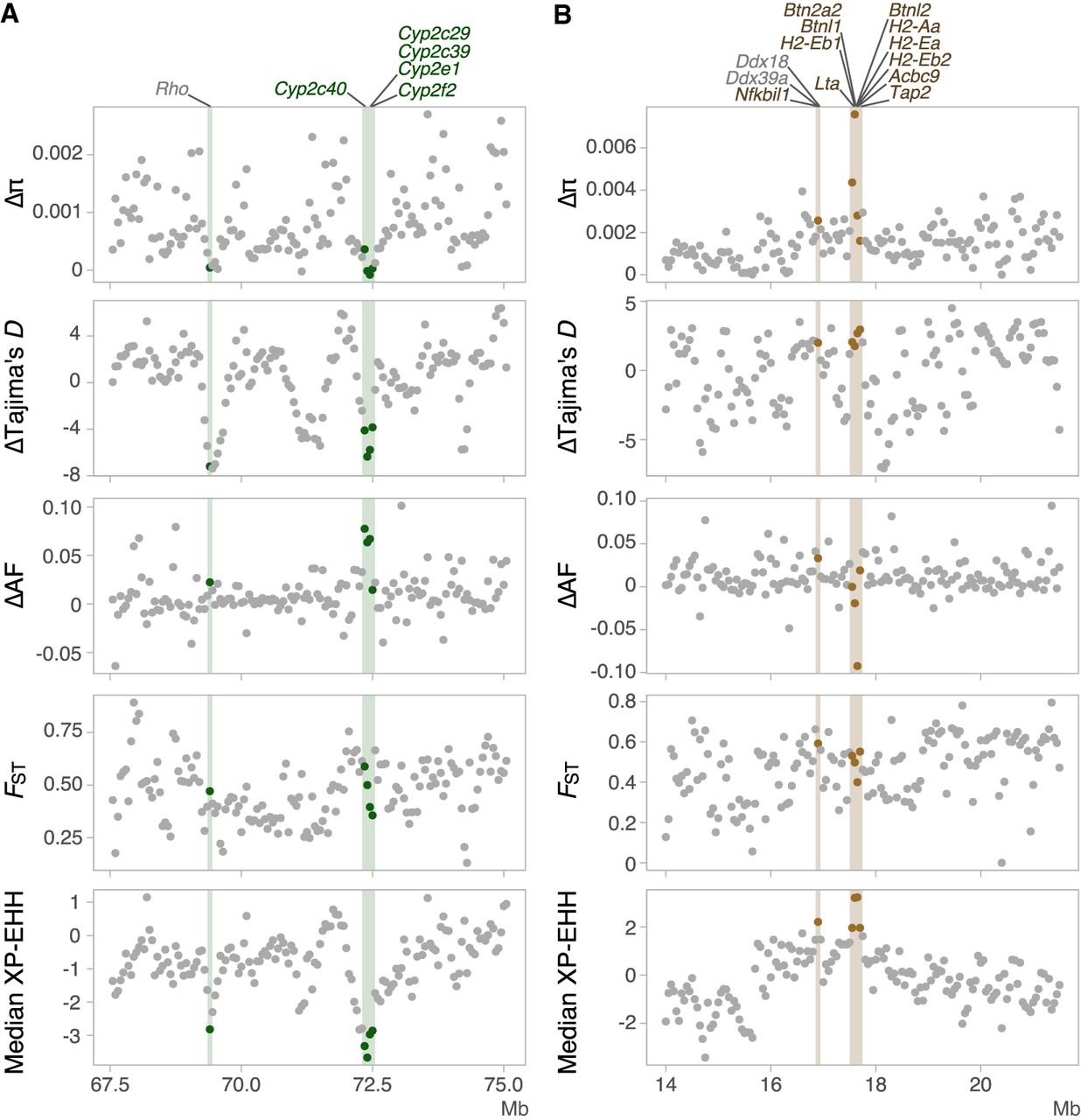 Examples of genomic landscapes around the regions for which hard selective sweeps were detected in common voles from Orkney or from the European continent. Δπ (πcontinent – πOrkney), ΔTajima's D (Tajima's Dcontinent –Tajima's DOrkney), ΔAF (AFcontinent – AFOrkney), FST, and median XP-EHH are shown. Each point represents one 50 kb window. Positively selected windows were marked with vertical lines. Genes overlapping with positively selected regions (outlier windows determined with DBSCAN with the highest or lowest one percentile of median XP-EHH value) are given on top. (A) Positively selected regions of continental voles had low Δπ, ΔTajima's D, and ΔAF. Genes belonging to the epoxygenase P450 pathway on M. arvalis Chromosome 4 are marked with green. (B) In Orkney voles, Δπ, ΔTajima's D, and ΔAF of positively selected regions did not form clusters outstanding from the genomic background. Genes related to antigen processing and presentation on Chromosome 15 are marked with brown.