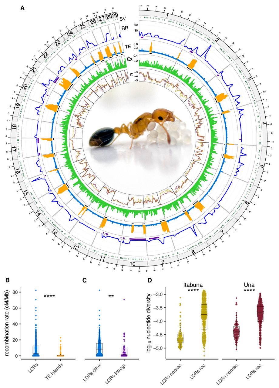 Recombination rate variation and genome architecture in C. obscurior. (A) Circos plot showing the following inward: (SV) the location of identified structural variants (dark green), (RR) recombination rates across the genome (cM/Mb) with introgressions depicted with purple bars, (TE) TE content (“LDRs”, blue; “TE islands”, orange) with the location of TE islands shown as black bars, (Ex) exon content, and (π) the log10-transformed nucleotide diversity in two natural populations for C. obscurior from Itabuna (gold) and Una (maroon). C. obscurior queen with brood (photo: L. Schrader). (B) Recombination rates between TE-poor regions (“LDRs” in blue) and TE-rich regions (“TE islands” in orange). (C) Recombination rates in introgressed regions (“LDRs introgr.” In purple) compared with the remainder of LDRs (“LDRs other” in blue). (D) Levels of nucleotide diversity (π) in nonrecombining (“LDRs nonrec.”) compared with recombining regions LDRs (“LDRs rec.”) in two populations of C. obscurior from Itabuna and Una. (****) P < 0.0001, (**) P < 0.01.