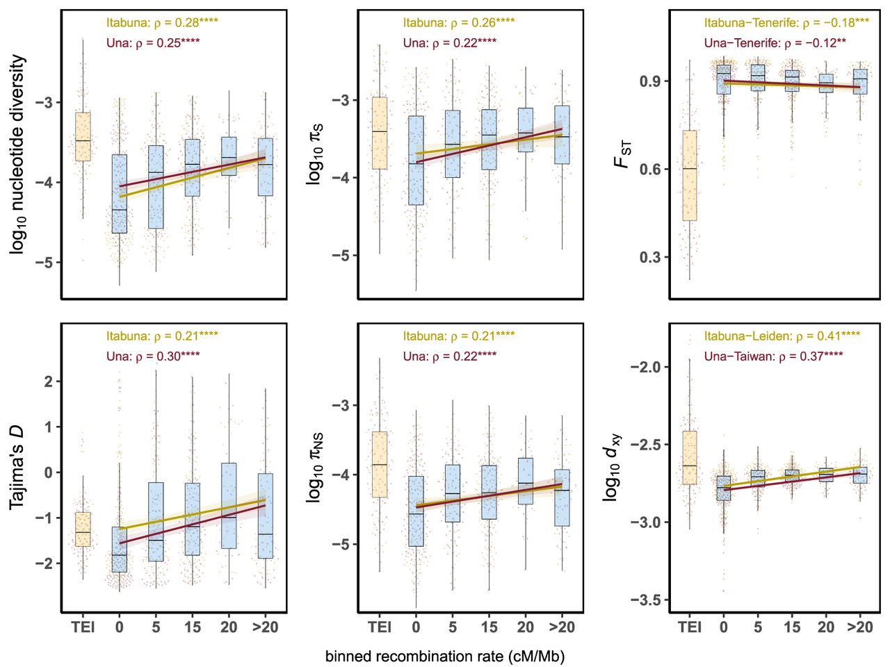 Relationship between recombination rates and measures of diversity in populations of C. obscurior. (Left) Correlation between recombination rates and nucleotide diversity and Tajima's D. (Middle) Correlation between recombination rates and nucleotide diversity at synonymous (πS) and nonsynonymous (πNS) sites. (Right) Correlation between recombination rates and levels of genetic differentiation (FST) and absolute divergence (dXY) between lineages of C. obscurior. The x-axis represents binned recombination rates, with the upper limit of each bin indicated and “TEI” referring to TE islands (orange boxplot). (ρ) Spearman's rank correlation coefficient, with significance shown by asterisks: (****) P < 0.0001, (***) P < 0.001, (**) P < 0.01. All correlations were performed using the raw data. Lines and shaded areas are linear regressions and 95% confidence intervals.