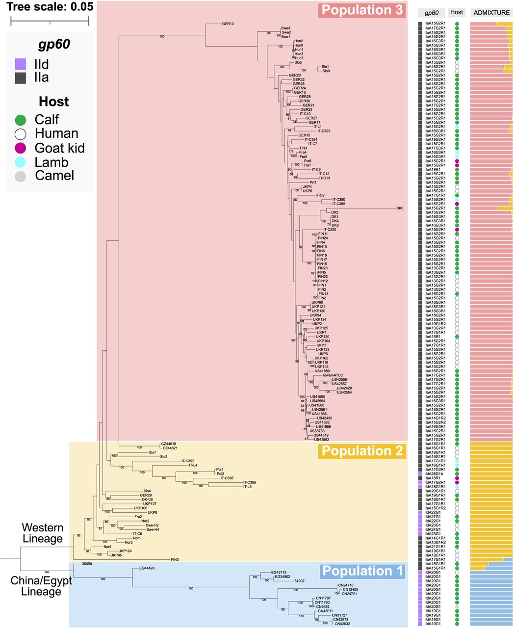 Maximum likelihood (ML) tree based on a set of 28,047 biallelic SNPs. Only bootstrap values greater than 60 are shown. Information about host, gp60 subtype, and results of ADMIXTURE is mapped on the phylogeny.