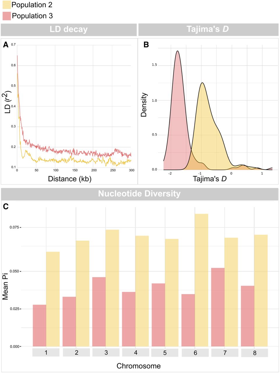 LD decay (A), distribution of Tajima's D values (B), and nucleotide diversity (π; C) in population 2 and population 3. Nucleotide diversity is shown with the mean π for each chromosome. Chromosome-specific results are provided in Supplemental Figure S8.