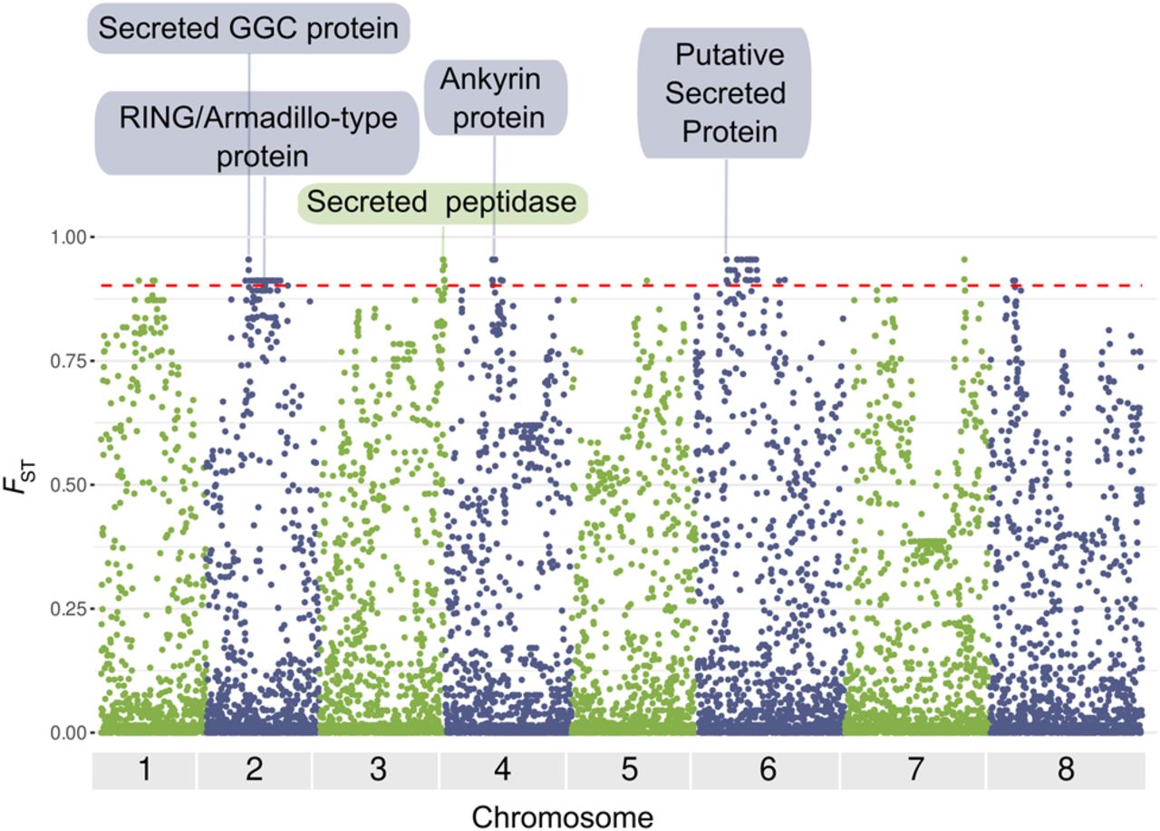 Manhattan plot of genome-wide Wright's Fst values, calculated in genomic regions of 1 kb, comparing population 2 and population 3. Fst values are shown on the y-axis and genomic positions on the x-axis. The dotted red line represents the cutoff value for the top 1%, equal to 0.91. Genes overlapping with the BUSTED analysis and with a function potentially associated with virulence or host–pathogen interactions are highlighted.