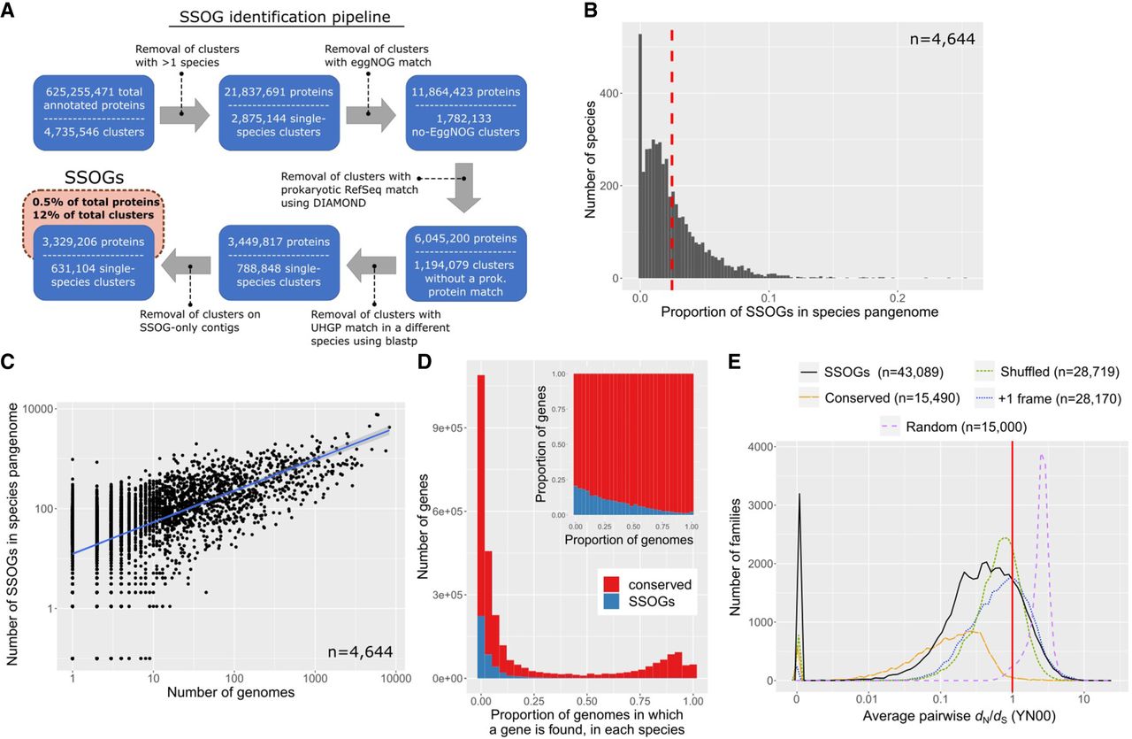 Large scale-identification of species-specific orphan genes (SSOGs) in the human gut microbiome. (A) The main steps of the computational workflow of similarity searches. (B) Distribution of the SSOG proportion in a given species’ pangenome. The red dashed line denotes the distribution mean. (C) SSOG number strongly correlates with the number of genomes available for a given species. (D) Distribution of percentage of genomes in which a gene is present for SSOGs and conserved genes. Only species with at least 10 genomes are included (n = 1369). The inset plot shows the same data but as relative proportion in each bin. (E) Distribution (60 bins) of the average pairwise omega (dN/dS) per family for SSOGs (solid black line), intraspecific alignments of conserved genes (orange), and three negative controls (for details, see Methods). The red line marks dN/dS = 1, which corresponds to neutral evolution.