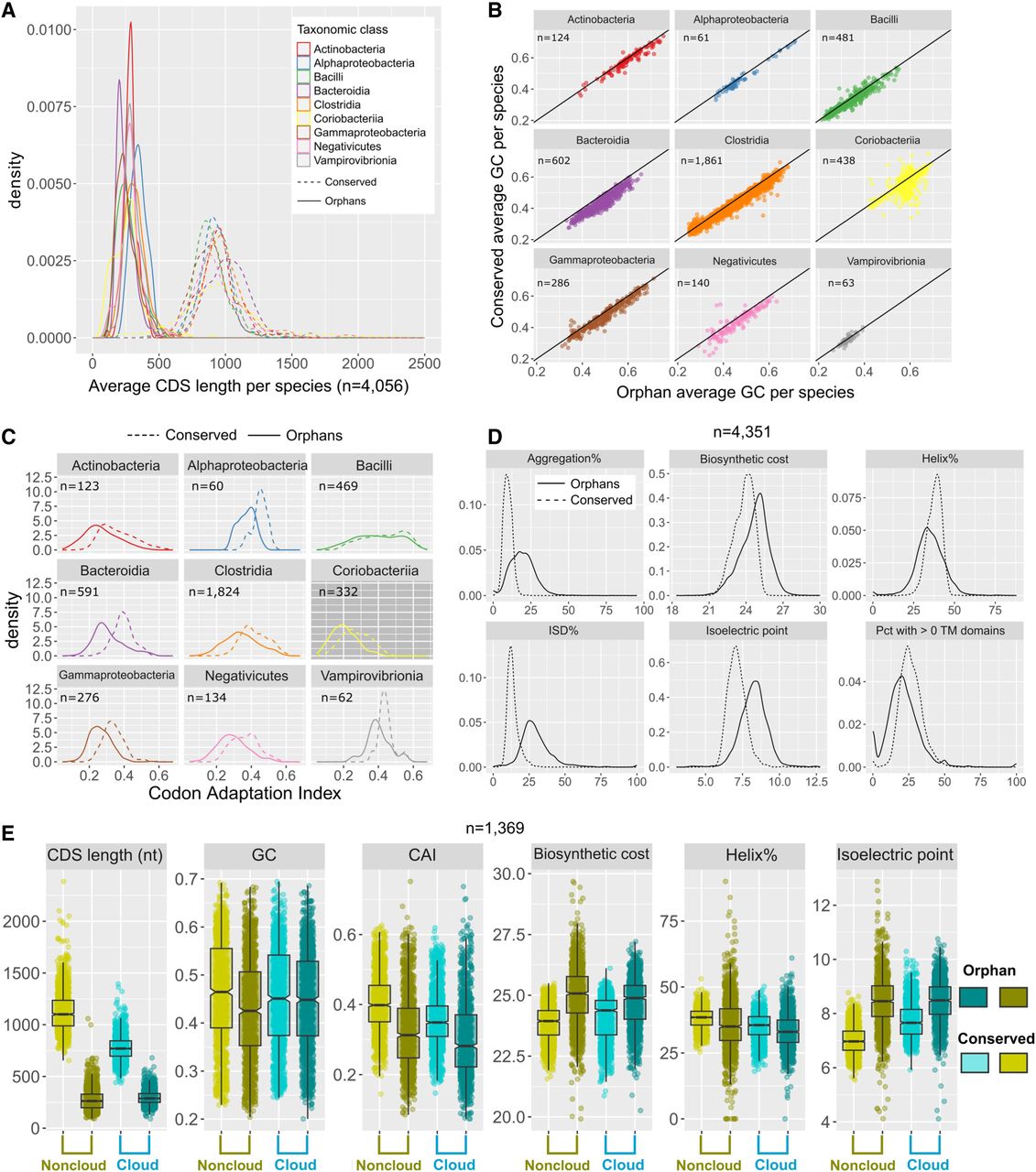 Properties of SSOGs compared with conserved genes. (A) Density plots of the average length of SSOGs and conserved CDSs in each species, grouped by each of the nine best represented taxonomic classes of our data set. Only classes with at least 50 species are included. (B) Average GC content of SSOGs and conserved genes in each species, grouped by taxonomic class (same classes as in A). (C) Same comparison as in A (average per species), but with codon adaptation index (CAI) values as predicted by the CAIJava tool. All Wilcoxon test P-values < 10−4. (D) Comparison of proteins encoded by conserved genes and SSOGs, in terms of average percentage of protein predicted to self-aggregate, biosynthetic cost, percentage of protein predicted to be helical, percentage of protein predicted to be disordered (ISD), isoelectric point of a protein, and percentage of proteins with at least one transmembrane domain. All Wilcoxon test P-values < 2.2 × 10−16. (E) Comparison of some of the properties found in panels A–D in 1369 species with at least 10 genomes in which SSOG and conserved gene categories are split into cloud (present in 10% of genomes or less) and noncloud. All plots show points or distributions of average values per species.