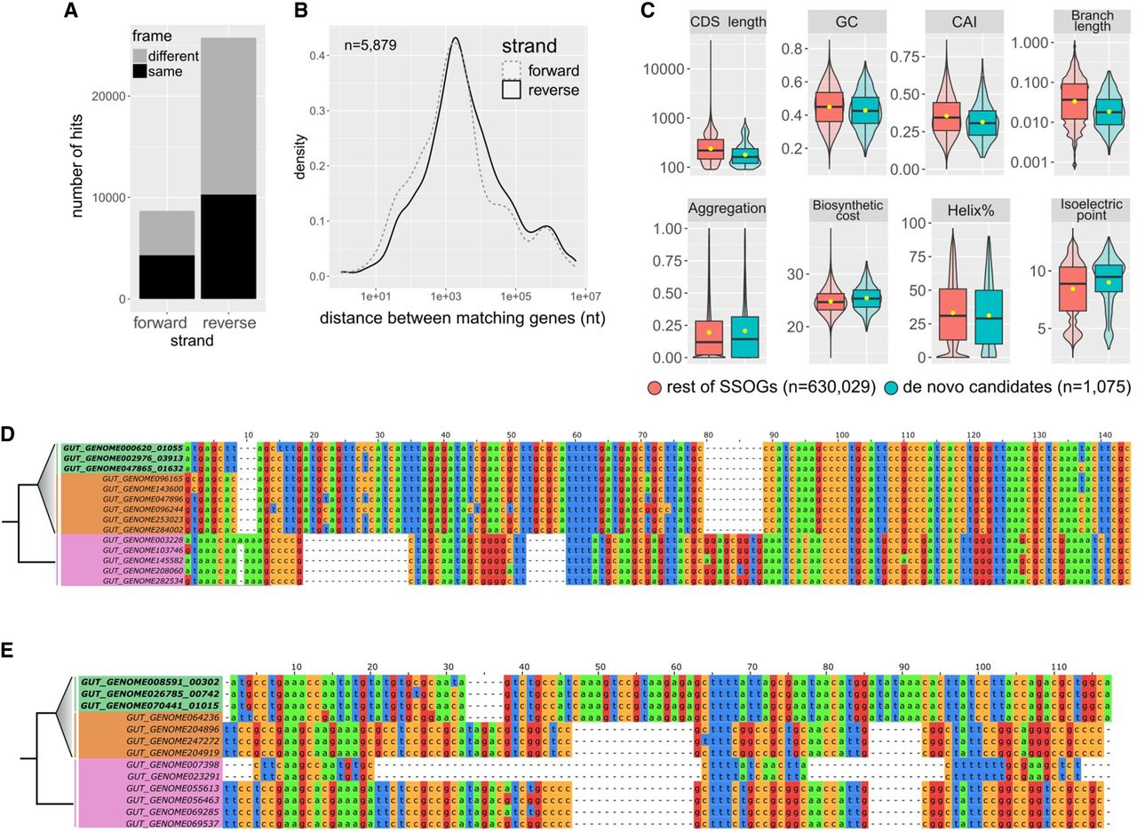 Evidence for native origination of SSOGs. (A) Distribution of frame and strand of similarity matches between SSOGs and conserved genes within each genome. (B) Distribution of genomic distances between matching SSOG and conserved gene when these are found on the same contig. (C) Comparisons of de novo candidates to remaining SSOGs: distributions of CAI, terminal species-level branch length, proportion of protein sequence predicted to be aggregation-prone, biosynthetic cost, CDS length, GC content, protein percentage estimated to fold into a helix, and isoelectric point. Details of statistical comparisons can be found in the main text. Helix% comparison Wilcoxon test P-value = 0.0064. Aggregation% P-value = 0.26. Branch length and CDS length are shown on log scale for visibility. Outliers are not shown as points but are represented by the violin plot range. (D) Alignment of a de novo candidate gene from Hafnia paralvei (green; three nonidentical members of an eight-member family are shown) to its orthologous regions in genomes of the same species that do not have annotated homologs (orange) and genomes of its closest outgroup species (pink). Identical sequences have been removed from the alignment. The average pairwise dN/dS for this family is 2.5. (E) Same as D, but for another candidate from an unnamed species of the order Opitutales. Three nonidentical members of a family of six members are shown. Five orthologous loci (i.e., from five genomes) that contain a long insertion have been removed for visual purposes, and an additional 37 orthologous loci are not shown again for visual purposes (their sequences are almost identical to those shown in the figure). The average pairwise dN/dS for this family is 3.4. Alignments were generated with MAFFT (Katoh and Standley 2013) and visualized with Jalview (Waterhouse et al. 2009).