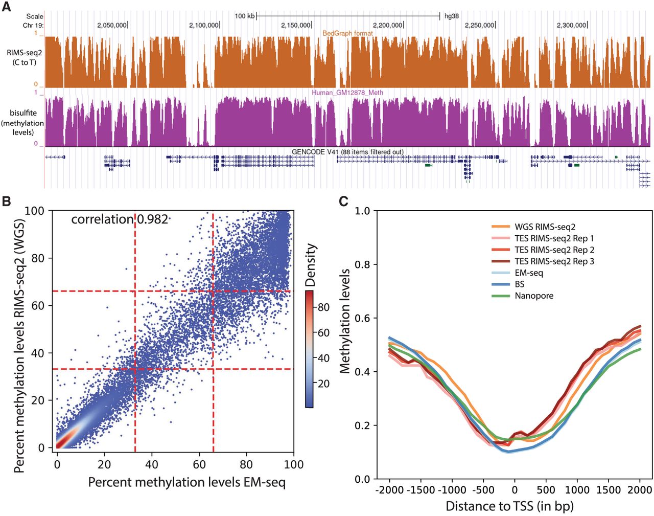 Performance of RIMS-seq2 (methylation). (A) C-to-T profile at a specific locus (combined 30 CpG sites) compared to methylation profile from bisulfite sequencing. (B) Methylation-level (RAML) correlation at CGIs between RIMS-seq2 and EM-seq. Each point corresponds to a CGI region (raw data provided in Supplemental Table S4). The plotting area has been divided into nine quadrants. (C) Methylation profiles at promoters measured by RIMS-seq2 (both WGS and TES), EM-seq (light blue), bisulfite sequencing (dark blue), and Nanopore (green). The overall percentage methylation of CpG sites was measured using 100 bp sliding windows within 2 kb upstream of and downstream from transcription start sites (TSSs). TSSs were defined using UCSC annotation. Distance to a TSS is measured in base pairs.