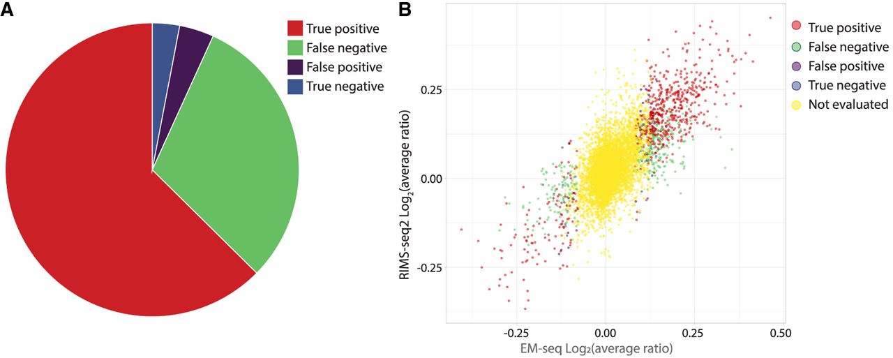 DMR identification using RIMS-seq2. (A) Pie chart of the performance of RIMS-seq2 compared with EM-seq with the number of CpG islands (CGIs) that are found as true positive (red), false negative (green), false positive (purple), and true negative (blue). (B) Correlation between the differential methylation in EM-seq and RIMS-seq2. The “not evaluated” (yellow) category represents CGIs with differences <10%, which were not used for analysis.