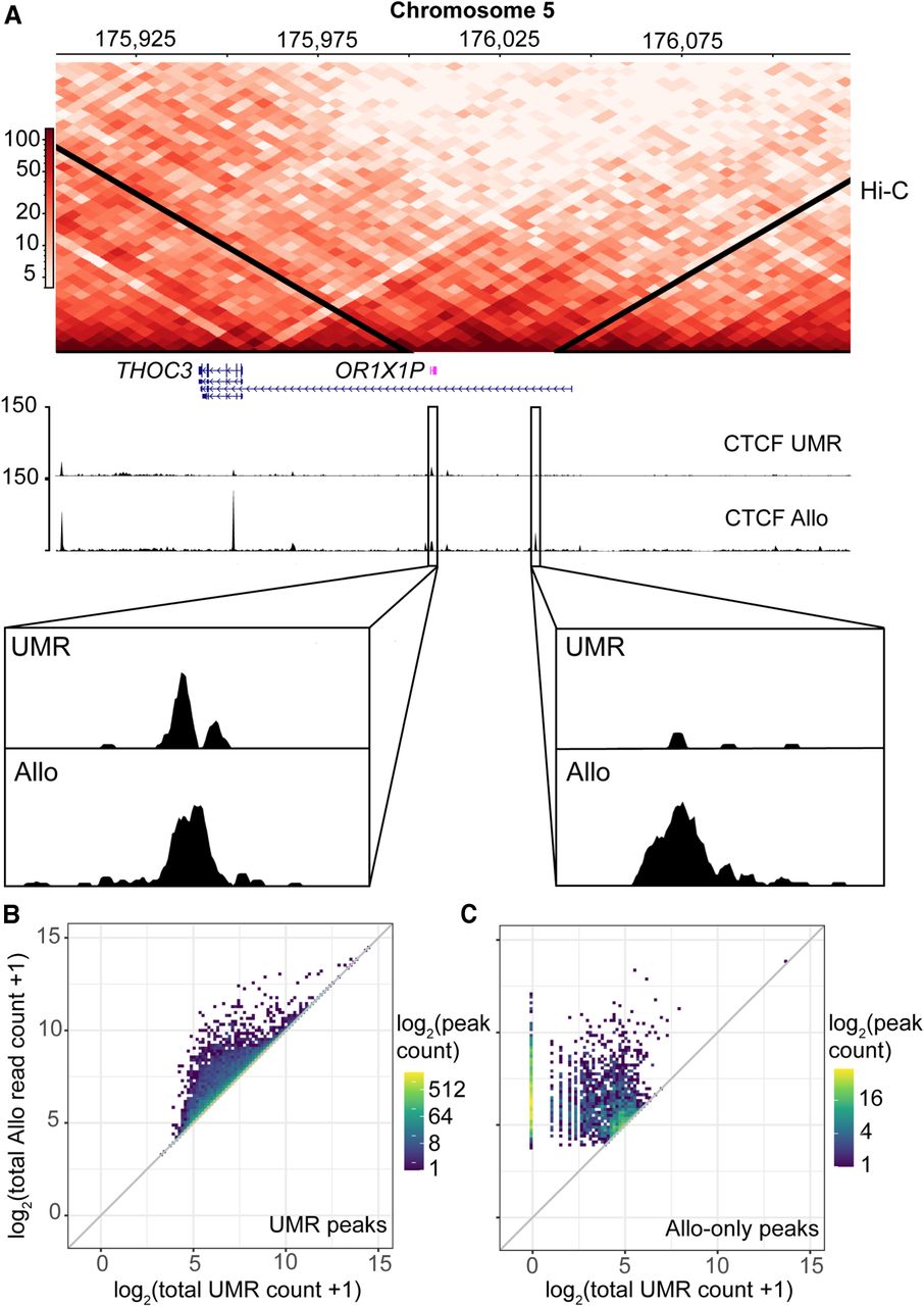 Allo increases the overall read counts at multimapped CTCF peaks and improves the resolution of uniquely mappable peaks. (A) Hi-C interaction heatmap showing two TAD boundaries on Chromosome 5 near the THOC3 gene. K562 CTCF read counts are also plotted for the UMR-only analysis and the Allo analysis. Bottom sections show the zoomed in version of two Allo-only peaks at these TAD boundaries. (B) Density scatterplot showing the total read count before and after the incorporation of Allo within CTCF UMR-derived peaks. (C) Density scatterplot showing the total read count before and after the incorporation of Allo within CTCF Allo-only peaks. Note that Allo was run using default settings, which allocates MMRs even in cases in which there are no nearby UMRs. This results in peaks called in regions with zero starting UMR counts as seen in panel C. The user can shut off this functionality using the argument “‐‐remove-zeros” to have more stringent criteria for MMR allocation.
