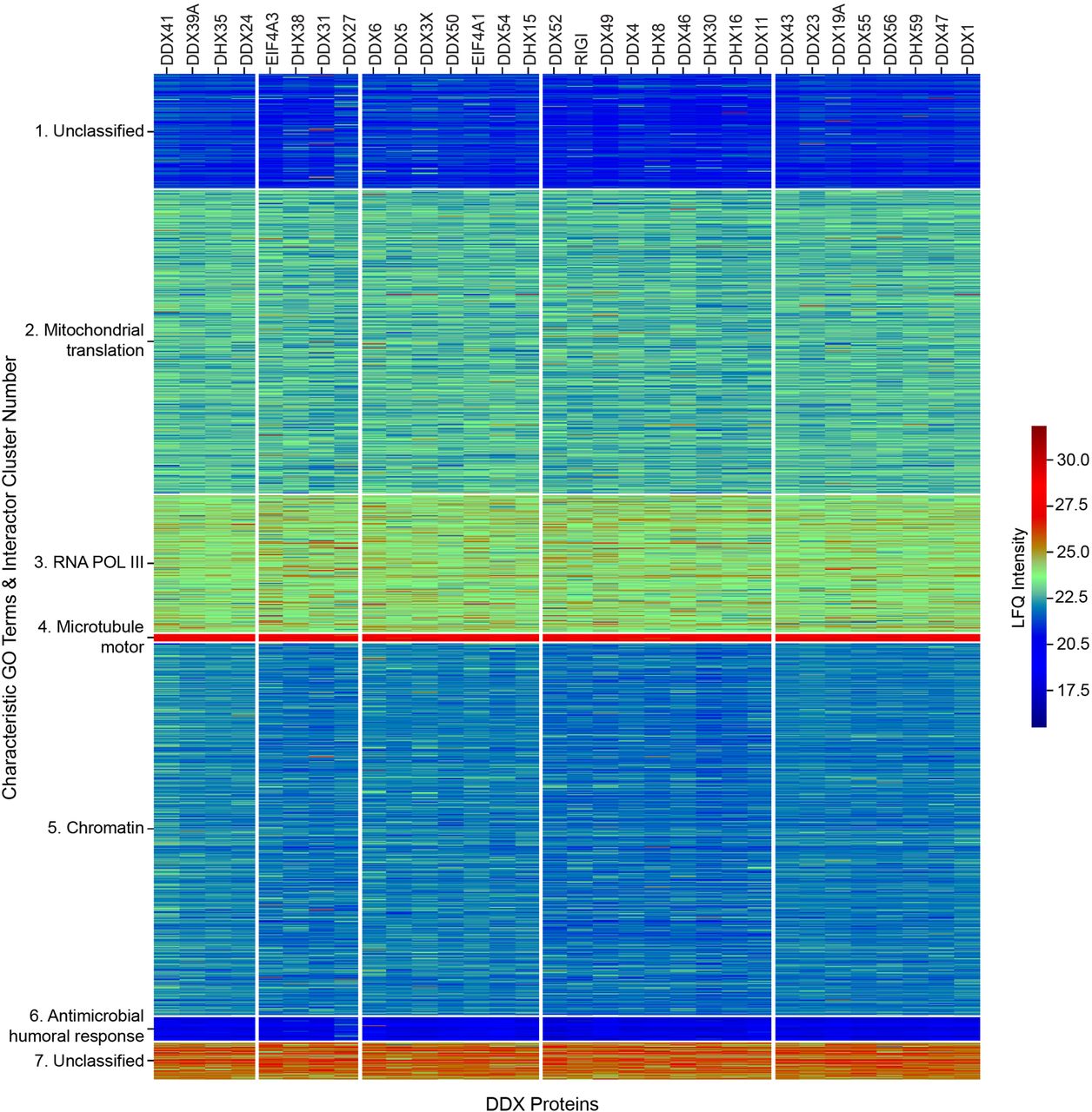 Seven clusters within the DDX/DHX interactome. Biclustering of the DDX/DHX interactome. Heatmap of the interactome (rows) against all DDX/DHX baits (columns). LFQ intensities from the IP-MS experiments were standardized row-wise to Z-scores. Rows and columns were clustered with spectral biclustering into seven row clusters and five column clusters. The heatmap was visualized using the seaborn library (https://doi.org/10.21105/joss.03021).