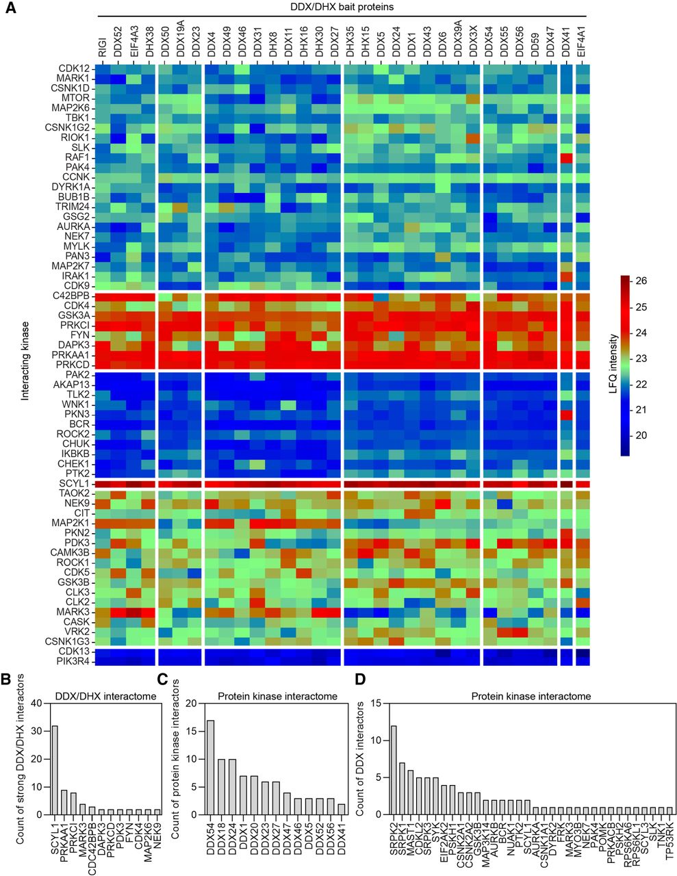 DDX/DHX proteins bind to protein kinases in HEK293T cells. (A) Heatmap of the interacting kinases (rows) against all DDX/DHX baits (columns). The empirical cumulative distribution function (eCDF) of the IP-MS data set was calculated, and the eCDF probabilities of the interacting kinases were plotted as a heatmap. Protein kinases (rows) of the heatmap were sorted by the values of the DDX/DHX baits (columns) with the highest value. The DDX/DHX baits (columns) were sorted by the values in the protein kinases (rows) with the highest value. Therefore, the highest eCDF value is in the top left corner, and the heatmap is sorted by the first row and first column. The heatmap was visualized using the seaborn library (https://doi.org/10.21105/joss.03021). (B) Bar plot indicating the number of DDX/DHX proteins interacting strongly (eCDF > 0.75) with the indicated kinase as retrieved from the DDX/DHX interactome screen. (C) Bar plot indicating the number of kinases interacting with the indicated DDX proteins as identified by Buljan et al. (2020). (D) Bar plot indicating the number of DDX proteins interacting with the indicated kinase as identified by Buljan et al. (2020).
