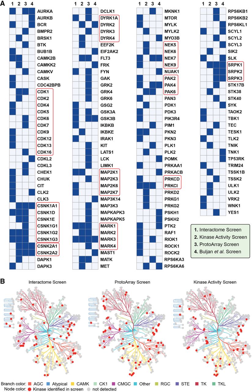 Ten candidate kinase families regulated by DDX/DHX proteins. (A) Kinases detected in one of the indicated screens are marked in blue. Kinase families are boxed in red in which at least one member was stimulated by and interacted with a DDX/DHX protein in vivo and in vitro. (B) Kinome trees depicting kinases (red) identified in the corresponding screen. For a more detailed view, see Supplemental Fig. S4.