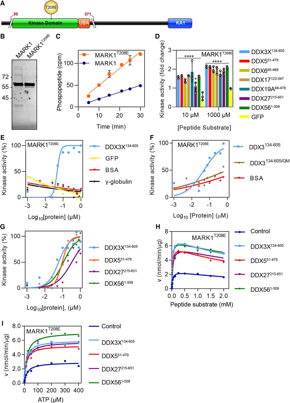 MARK1 activity is stimulated by DDX proteins in vitro. (A) Schematic of MARK1 with the boundaries indicated in red for the truncated recombinant protein used (aa 50–371). (UBA) Ubiquitin association domain, (KA1) kinase-associated domain 1, and (T208E) phosphomimetic mutation for activated MARK1. Cartoon generated using IBS v1.0.3 (Liu et al. 2015). (B) SDS-PAGE gel stained with Coomassie blue of MARK1 expressed in and purified from E. coli. (C) In vitro kinase assay linearity of MARK1 and MARK1T208E. (D) In vitro kinase assay with MARK1T208E with the addition of different DDX core domain proteins both at low (10 µM) and high (1000 µM) peptide substrate. (****) P > 0.0001. (E) In vitro kinase assay using MARK1T208E and increasing amounts of either DDX3X132–605 or different negative control proteins for EC50 determination. (F) In vitro kinase assay using MARK1T208E and increasing amounts of either DDX3X132–605, DDX3 QM, or BSA as control proteins. (G) In vitro kinase assay using MARK1T208E and increasing amounts of DDX core domain proteins for EC50 determination. (H) In vitro kinase assay using MARK1T208E with the addition of DDX core domain proteins and increasing concentrations of peptide substrate at saturating ATP concentration. (I) In vitro kinase assay using MARK1T208E with the addition of DDX core domain proteins and increasing concentrations of ATP at saturating peptide concentration.