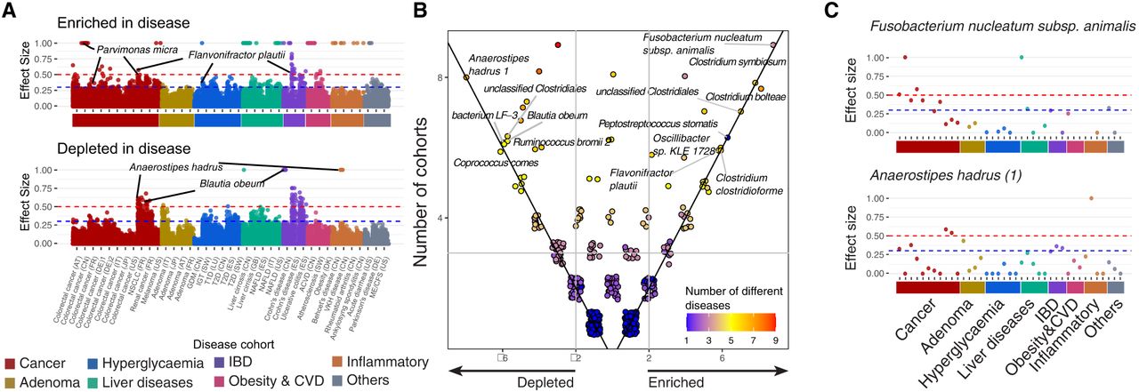 Pan-metagenomics association studies (Pan-MGAS) of 43 cohorts from 23 different diseases and 14 countries (n = 2185). (A) We identified significantly enriched (top) and depleted (bottom) species of cohorts based on the effect sizes (ESs) of Wilcoxon rank-sum one-sided tests (ES ≥ 0.3; i.e., each dot represents the ES of an MSP in each disease data set); the complete list of values is provided in Supplemental Table S5. The blue dotted line indicates ES = 0.3; the red dotted line indicates ES = 0.5; and each dot in the plot represents one MSP within one disease cohort. (B) Scatter plots of the frequency of the significantly enriched/depleted cohorts of all MSPs (ES > 0.3): Each point represents an MSP; all values in the plot are integers; and jitter was added to remove overlapping points. The y-axis displays the total frequency of enriched/depleted cohorts (number of enriched cohorts + number of depleted cohorts), and the x-axis displays the subtracted frequency between enriched cohorts and depleted cohorts (number of enriched cohorts − number of depleted cohorts). Point coloring is based on the number of different diseases for which an MSP had an ES above 0.3. Commonly enriched/depleted species among cohorts were identified when total frequency ≥ 3 and absolute subtracted frequency ≥ 2. (C) Species found depleted (Anaerostipes hadrus) and enriched (Fusobacterium nucleatum subsp. animalis) in most disease cohorts. The blue dotted line indicates ES = 0.3; the red dotted line indicates ES = 0.5; and each dot in the plot represents one MSP within one disease cohort. Acronyms are as follows: (ACVD) acute coronary cardiovascular disease, (Ob) obesity, (CRC) colorectal cancer, (NSCLC) non-small-cell lung cancer, (RCC) renal cell carcinoma, (GDM) gestational diabetes mellitus, (T1D) type 1 diabetes, (T2D) type 2 diabetes, (LC) liver cirrhosis, (NAFLD) nonalcoholic fatty acid liver, (UC) ulcerative colitis, (CD) Crohn's disease, (BD) Behçet's disease, (RA) rheumatoid arthritis, (SPA) ankylosing spondylitis, (ME/CFS) myalgic encephalomyelitis/chronic fatigue syndrome, and (PD) Parkinson's disease.