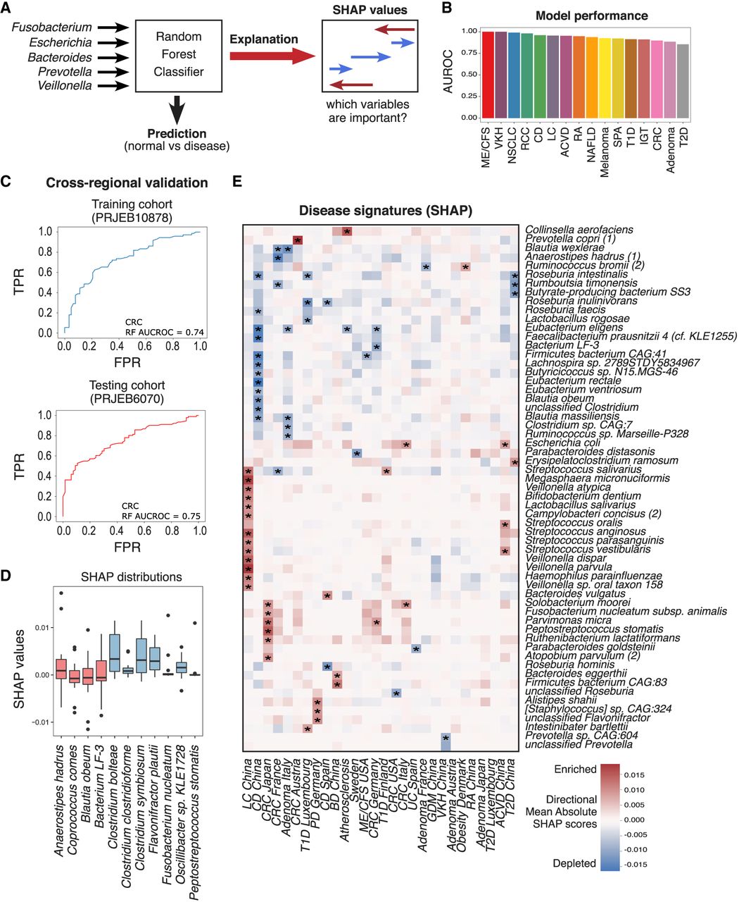 Random forest (RF) models trained on multiple cohorts to discriminate between disease and healthy controls. (A) Schematic of RF classification method. (B) AUROC scores for each disease RF classification model. (C) AUROC curves of an inter (top) and intra (bottom) cohort validation for a RF model that predicts CRC. (D) Box plot of directional mean absolute SHAP scores for all disease predictive models. Red and blue boxes represent species that were depleted/enriched using effect size calculation. (E) Clustered heatmap (dendrogram omitted) of the most important species for prediction of 16 diseases by RF classification as calculated by directional mean SHAP score (rows contain at least one species with directional mean SHAP score above 0.0125 in any of the diseases; Methods). Positive values indicate that higher relative abundance is more likely to classify the disease versus healthy samples. Negative values indicate that lower relative abundance is more likely to classify the disease versus healthy samples. The right color bar indicates mean species bias for enrichment or depletion in all diseases. Acronyms are as follows: (CRC) colorectal cancer, (NSCLC) non-small-cell lung cancer, (RCC) renal cell carcinoma, (T1D) type 1 diabetes, (T2D) type 2 diabetes, (LC) liver cirrhosis, (NAFLD) nonalcoholic fatty acid liver, (CD) Crohn's disease, (RA) rheumatoid arthritis, (SPA) ankylosing spondylitis, (ME_CFS) myalgic encephalomyelitis/chronic fatigue syndrome, (IGT) impaired glucose tolerance, and (VKH) Vogt–Koyanagi–Harada.