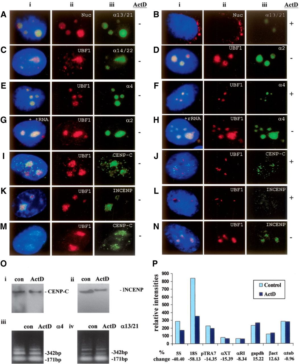 (A–H) Subnuclear distribution of centromeric α-satellite RNA and proteins in HeLa cells. Unless otherwise stated, images were captured on a conventional fluorescence microscope. Simultaneous RNA-FISH detection of α-satellite RNA specific for chromosomes 13/21 (Aiii; green), 14/22 (Ciii; green), 2 (Diii; green) and 4 (Eiii; green); and immunofluorescence detection of nucleolar proteins nucleolin (Nuc) (Aii; red) and UBF1 (Cii, Dii, Eii; red) in human HeLa cells. ActD treatment at 0.05 μg/mL resulted in the delocalization of α13/21- (Biii; green) and α4- (Fiii; green) satellite RNA, nucleolin (Bii; red), and UBF1 (Fii; red) from the nucleoli. UBF1 displayed a typical relocalization toward the nucleolar periphery to give a concentrated cap-like signal at the tip of the nucleoli (Fii; red). Competition with tRNA and rRNA (10× excess amount) did not affect the detection of α-satellite RNA at the nucleoli as exemplified by the chromosome 2- and 4-specific α-satellite RNA signals (Giii, Hiii; green). (I–L) Nucleolar accumulation of CENPC1 (Iiii; green) and INCENP (Kiii; green), as indicated by coimmunostaining with UBF1 (Iii, Kii, respectively; red). CENPC1 and INCENP both delocalized from the nucleoli following ActD treatment (Jiii, Liii, respectively; green). (M) Confocal laser scanning microscopy analysis showing nucleolar accumulation of CENPC1 by differential interference contrast images (iii; green) and coimmunostaining with UBF1 (ii; red). (N) Confocal microscopy analysis showing nucleolar accumulation of INCENP (iii; green) and coimmunostaining with UBF1 (ii; red). (i) Merged images of ii and iii. Antibodies used were as described in the Methods, except for the anti-CENPC1 antibody used in Miii, which was kindly provided by Dr. Bill Earnshaw. (O) Effect of ActD treatment on the expression level of CENPC1, INCENP, and α-satellite RNA. Total cell lysates were prepared from HeLa cells with (ActD) and without (con) prior treatment with 0.05 μg/mL ActD for 6 h, and subjected to Western blotting analysis. The expression levels of both CENPC1 (i) and INCENP (ii) remained unchanged following ActD treatment. (iii) Total RNA was prepared from untreated and ActD-treated HeLa cells. RT-PCR was performed on the RNA using primer sets corresponding to the α4- and α13/21-specific α-satellite sequences. A 171-bp ladder of monomeric α-satellite sequences was seen. No significant difference in the intensities of PCR products was detected following 6 h ActD treatment. (P) Nuclear run-on transcription assay to assess the effect of ActD treatment on α-satellite transcription. Equal numbers of nuclei were used for each assay, as determined by the DNA concentration. The effect of ActD on the transcription of α-satellite was measured by comparing the hybridization signals of in vitro-synthesized 32P-labeled run-on transcripts with immobilized DNA. The radioactive signals for the ribosomal genes 5S and 18S were decreased following ActD treatment, but the signals for the transcription of RNA polymerase II-driven genes (such as GAPDH, beta-actin, and alpha-tubulin) and those of α-satellite DNA (pTRA7 [chromosomes 13/14/21-specific], αXT [chromosomes 14/22-specific], and αRI [chromosomes 13/21-specific]) (Lo et al. 1999) were not significantly affected.