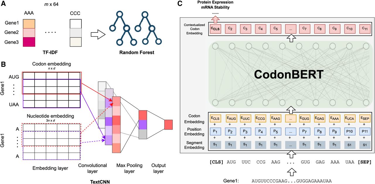 Comparison to prior methods (TF-IDF, Codon2vec, RNABERT, and RNA-FM) and fine-tuning CodonBERT on downstream data sets. (A) Given an input corpus with m mRNA sequences, TF-IDF is used to construct a feature matrix followed by a random forest regression model. (B) Use a TextCNN model to learn task-specific nucleotide or codon representations. The model is able to fine-tune pretrained representations by initializing the embedding layers with stacked codon or nucleotide embeddings extracted from pretrained language models (Codon2vec, RNABERT, and RNA-FM). n is the number of codons in the input sequence, and d is the dimension of the token embedding. As a baseline, plain TextCNN initializes the embedding layer with a standard normal distribution. (C) Fine-tune the pretrained CodonBERT model on a given downstream task directly by keeping all the parameters trainable.