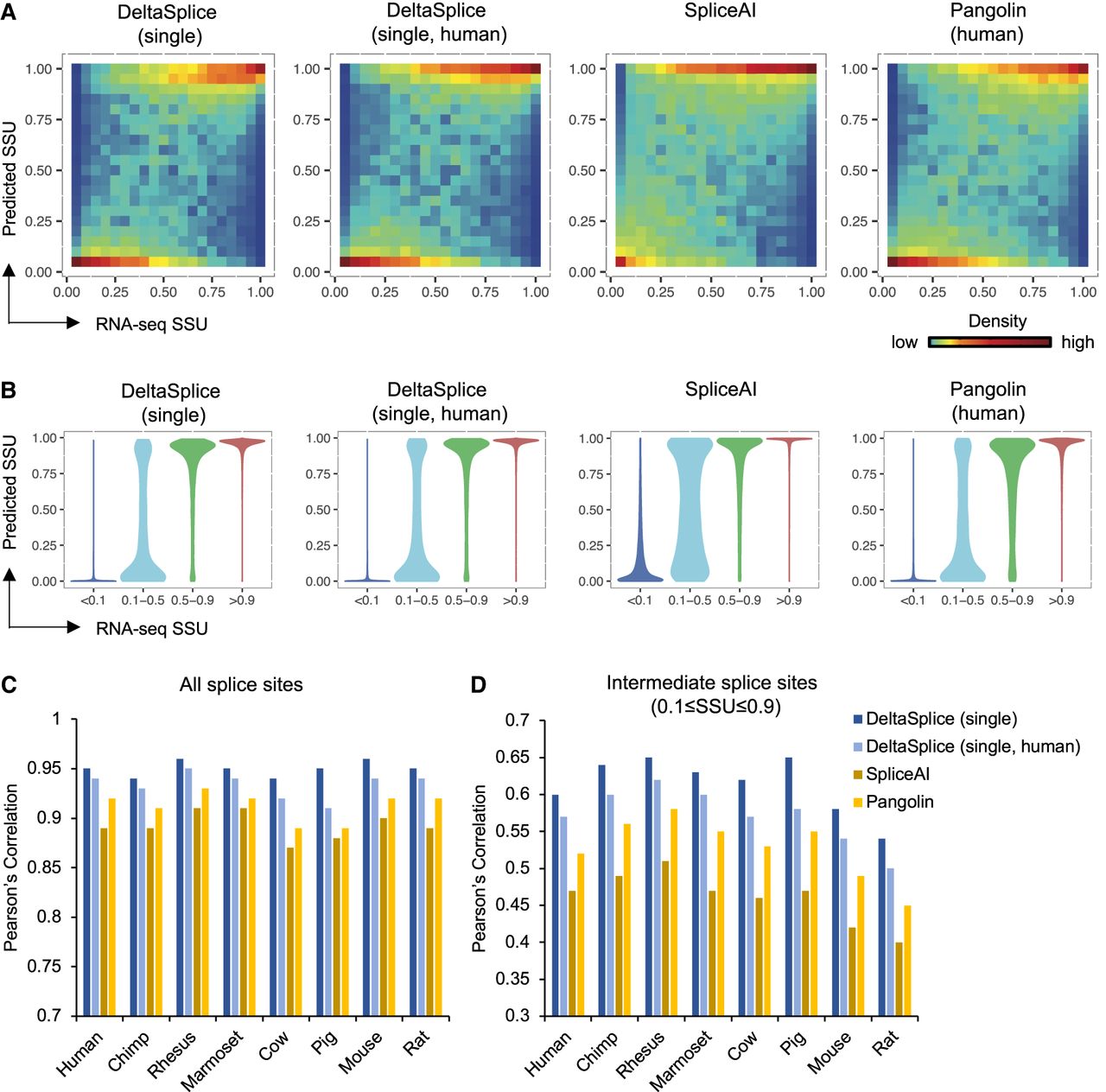 The performance of DeltaSplice in single-sequence mode and baseline methods in predicting SSU across different species. (A) Distribution of human SSU predicted by different methods in comparison with experimental measurements by RNA-seq. DeltaSplice (single) refers to DeltaSplice in single-sequence mode trained with data from all species, and DeltaSplice (single, human) was the model in single-sequence mode trained using only human data. Pangolin was retrained with human SSU data to facilitate a fair comparision, considering that the original Pangolin model was trained with SSU estimated from different RNA-seq data set using a different implementation. The SpliceAI model from the original study, which was trained on human gene splice sites, was used here. (B) Similar to A, but splice sites are binned into four groups based on RNA-seq SSU values. The four groups have 83,251 (<0.1), 6370 (0.1–0.5), 10,672 (0.5–0.9), and 113,752 (>0.9) splice sites, respectively. (C) Pearson's correlation between RNA-seq and predicted SSU for all splice sites. (D) Similar to B, but for splice sites with experimental SSU between 0.1 and 0.9.