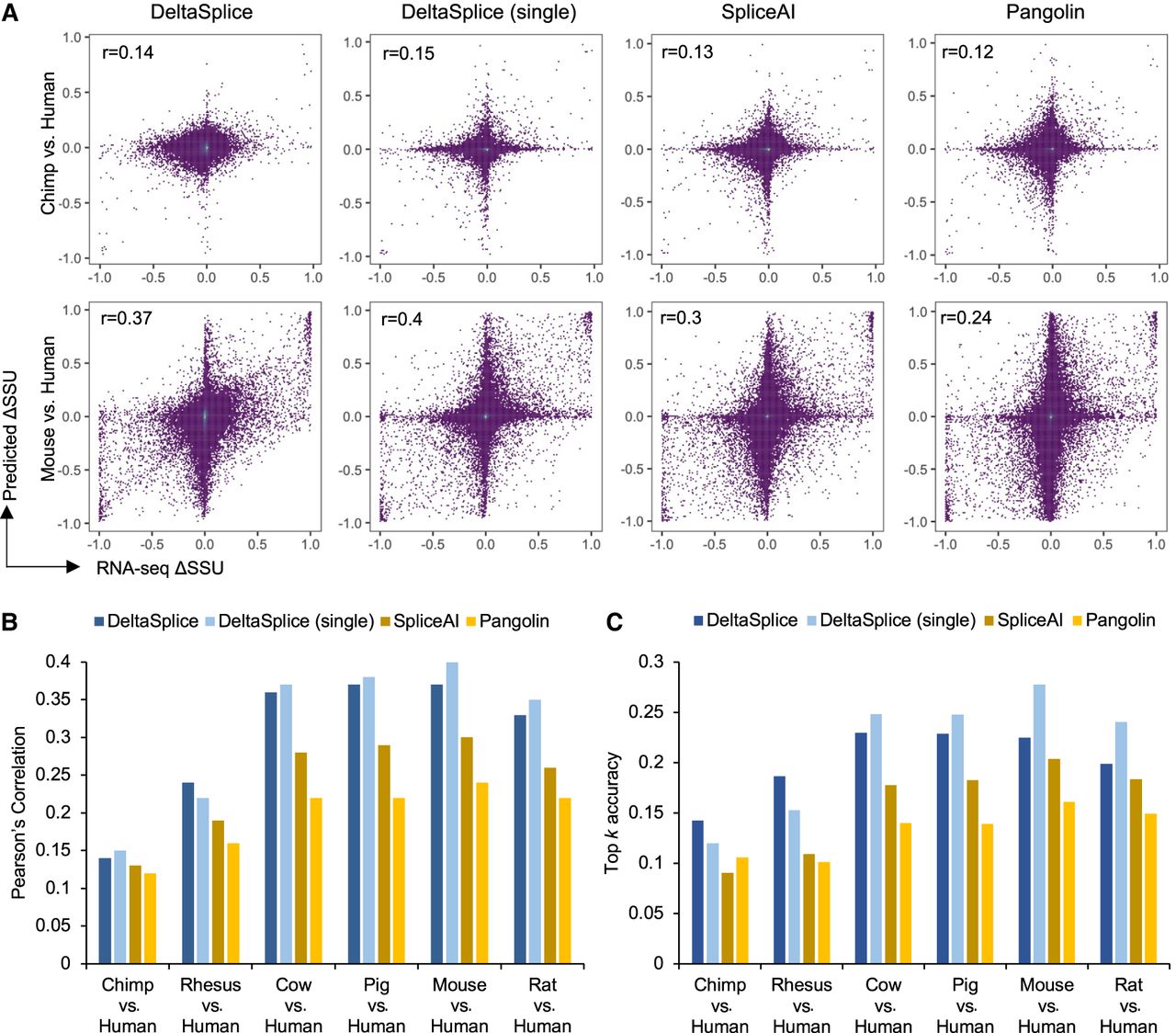The performance of DeltaSplice and baseline methods in predicting ΔSSU of splice sites homologous to humans. (A) Distribution of ΔSSU between chimpanzee and human (top) and between mouse and human (bottom). In each panel, ΔSSU measured by RNA-seq is shown on the x-axis, and ΔSSU predicted by different methods is shown on the y-axis. DeltaSplice refers to the results obtained using the dual-sequence mode, and DeltaSplice (single) refers to the results obtained using the single-sequence mode. The retrained Pangolin and the original SpliceAI models were used. (B) Pearson's correlation between RNA-seq and predicted ΔSSU of splice sites homologous to humans using different methods. (C) Top k accuracy of different methods in predicting splice sites with |ΔSSU| ≥ 0.2, where k is the true number of exons showing the specified differences.
