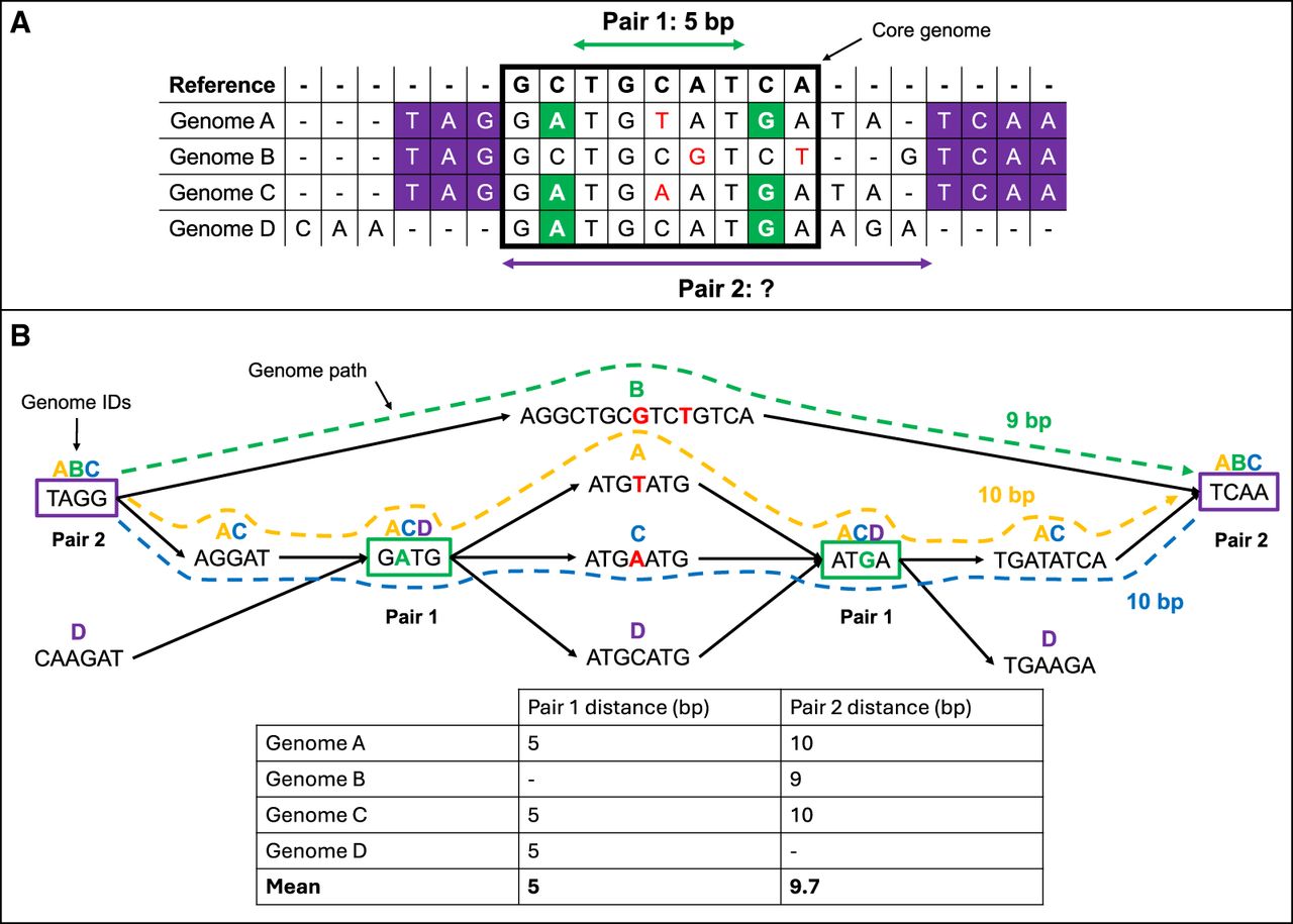 Comparison of MSA- and DBG-based GWES. (A) MSA-based GWES uses distances calculated from alignment of genomes to a reference. Only variants found within blocks of sequence shared with the reference, for example, within the core genome, can be detected and have distances calculated between them, exemplified by pair 1. Pair 2, which is variants found within the accessory genome, do not align to the reference, meaning the distance between them cannot be calculated and so is ignored from the mutual information (MI) calculation. (B) Using a DBG, distances can be calculated for pair 2 by traversing the graph for each genome containing this pair of variant, and then by calculating the mean distance between them. The DBG can also be used to calculate the distance for pair 1 using the same approach. Therefore, variant pairs in both the core and accessory genome can be identified.