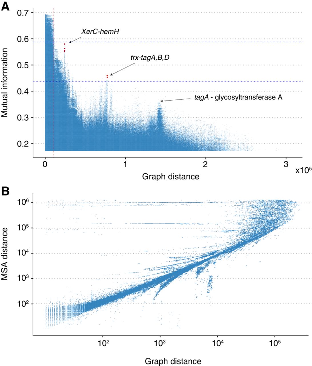 Analysis of long-read E. faecalis assemblies. (A) A Manhattan plot indicating the strength of LD measured using MI versus the genomic distance in the graph. Unitig pairs with an average distance exceeding the standard deviation of their distances have been filtered out. Strong links of coselection were identified between an intergenic region adjacent to the trxB gene and the three genes tagA, -B, and -D in addition to a link between a site-specific XerC family tyrosine recombinase and an intergenic region between a tRNA gene and a ferrochelatase-encoding hemH. The vertical red line indicates the distance threshold below which it is difficult to distinguish outlier peaks from the background LD distribution. Pairs with MI values significantly above the background at a given distance are likely to be impacted by either epistasis or coselection. (B) Pairwise distances between loci within a single genome and those found using the PAN-GWES graph-based approach. The correlation, particularly over shorter distances, indicates that the PAN-GWES algorithm can accurately distinguish LD driven by proximity within the genome from LD indicative of coselection or epistasis. The horizontal lines are caused by k-mers associated with mobile elements that appear in different locations within each genome but are fixed within the single reference.