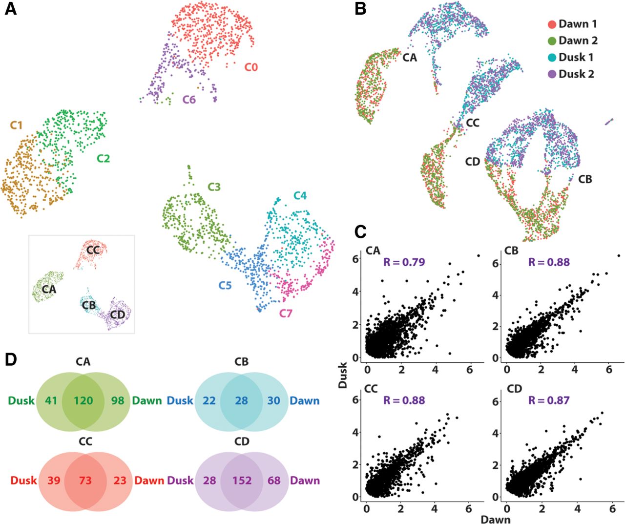 Dusk and dawn transcriptomes are well conserved, although many genes show TOD responses. (A) UMAP visualization of the dawn scRNA-seq atlas reveals eight distinct clusters, organized around four superclusters (inset). (B) Integration of dusk and dawn data sets reveals a mirror image arrangement of superclusters, indicating a strong conditional transcriptome distinction that does not override cell identity. (C) Gene expression correlation between dusk and dawn replicates of distinct superclusters reveals high correlation. Genes expressed in >10% of the cells in each supercluster were used in each instance. (D) Venn diagrams showing just a partial conservation of DEGs between superclusters of dusk and dawn conditions, indicating that sampling across TOD identifies unique tissue-specific DEGs. Identities of superclusters CA, CB, CC, and CD are matched across data sets.
