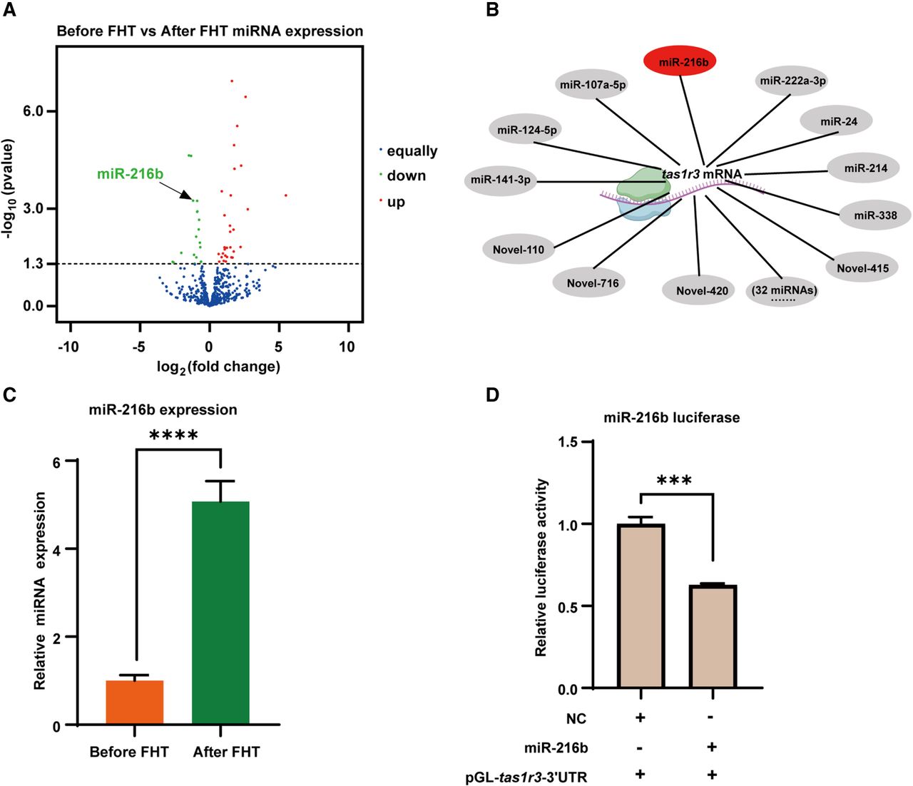 miR-216b is responsible for regulating the expression of tas1r3. (A) Volcano map of intestine miRNAs expression levels in grass carp before or after the FHT from carnivore to herbivore. (B) The miRNAs putative binding to tas1r3 3′ UTR. Gray means no significantly difference; red means significantly differentially expressed miRNAs of grass carp before and after the FHT. (C) The expression analysis of microRNA expression in intestine of grass carp before and after the FHT (n = 10). (D) Relative dual-luciferase activity analysis was performed to detect the effects of microRNA on tas1r3 3′ UTR activity (n = 3). (***) P < 0.001, (****) P < 0.0001.