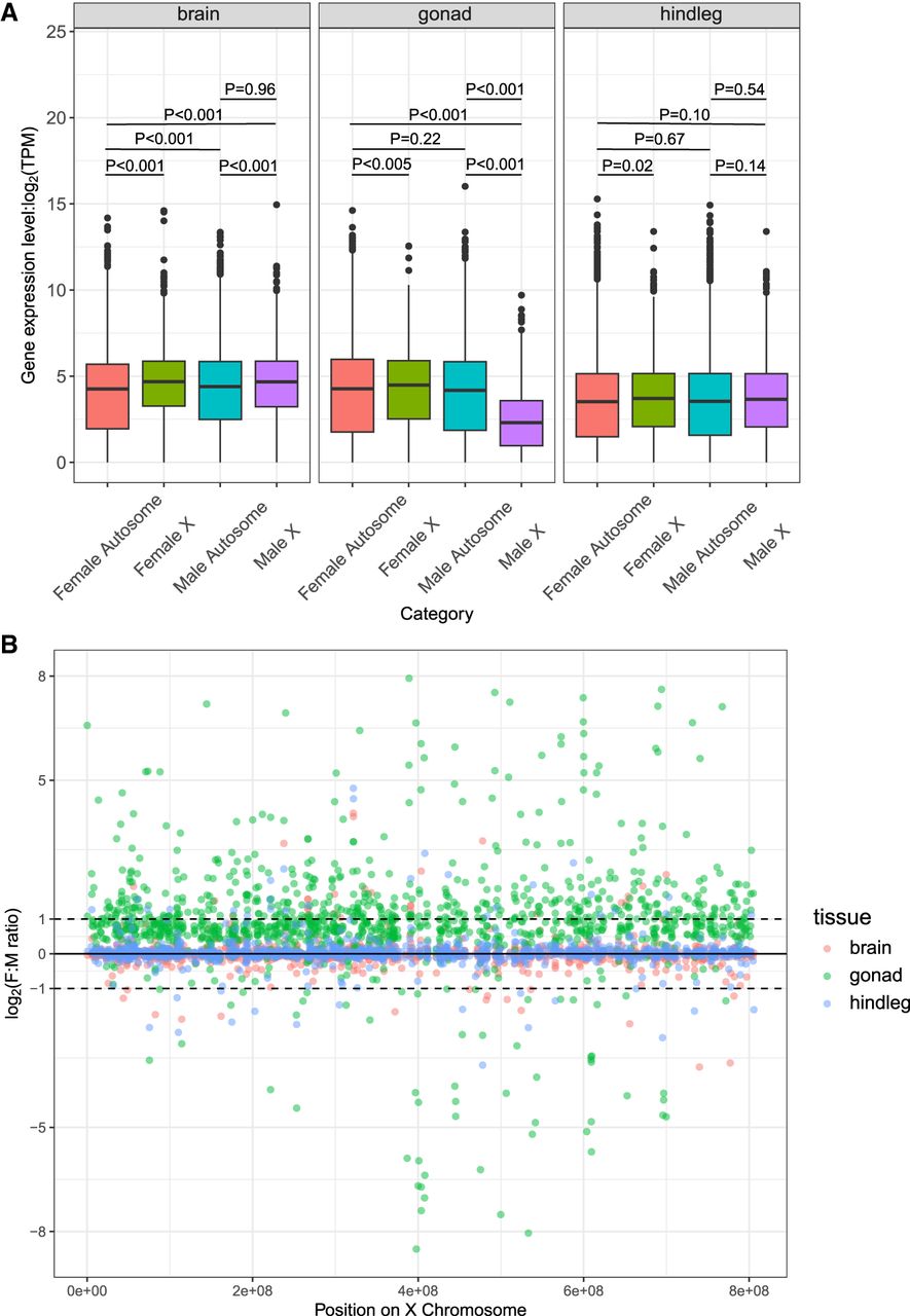 Dosage compensation in L. migratoria. (A) Box plots of gene expression from different tissues, sexes, and chromosomes. P-values were calculated based on 1000 bootstrap replicates. (B) log2 (female expression level:male expression level) along the X Chromosome.