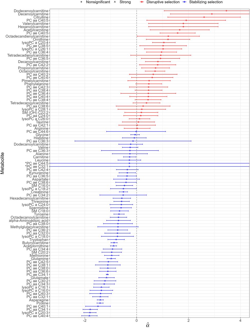 > 0). Circle symbols represent nonsignificant selection estimates; triangles refer to metabolites with a selection strength