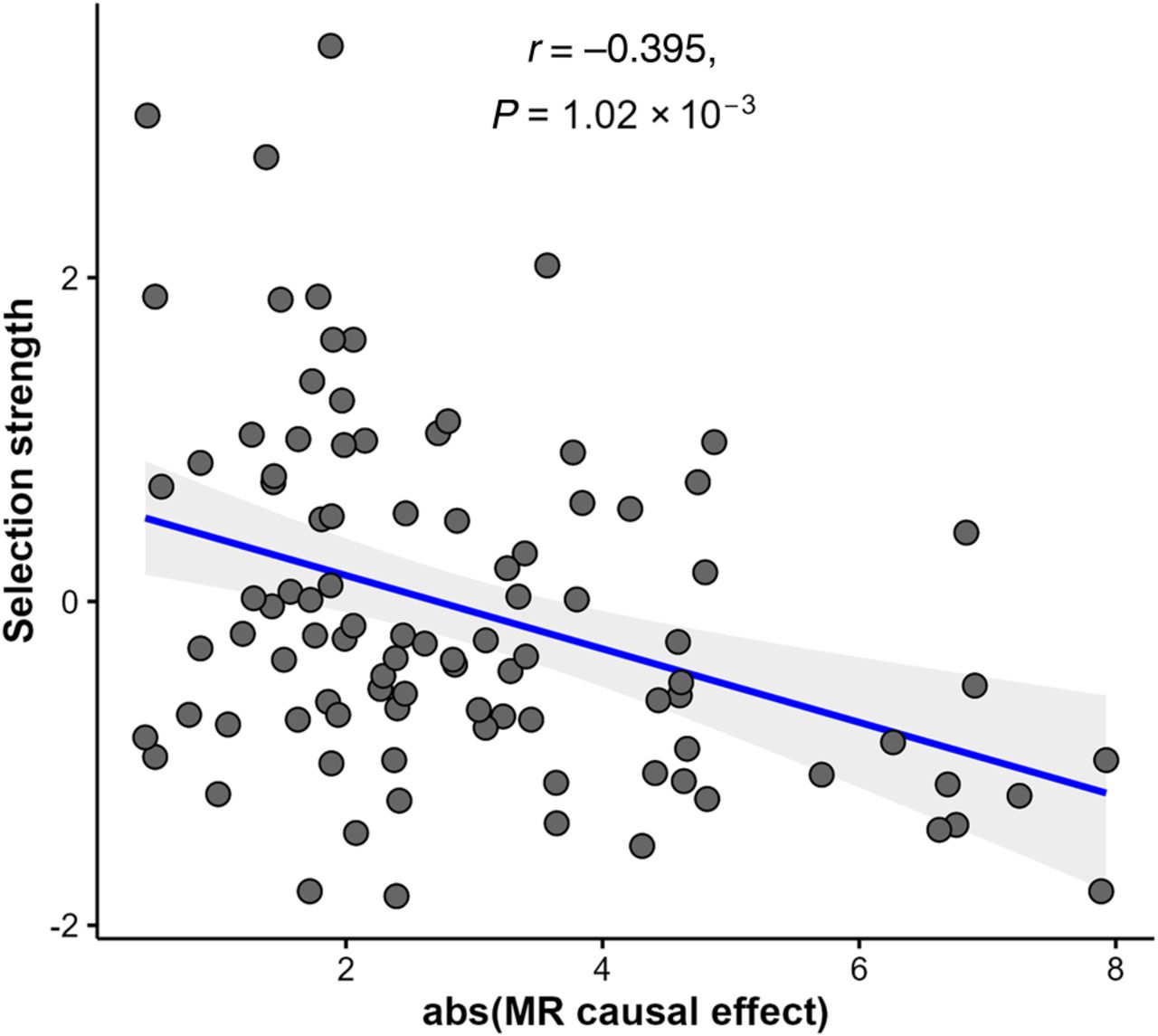 The relationship between metabolite importance (measured as total absolute causal effect size on 51 complex traits) and selection strength for 97 metabolites with genetic instruments.