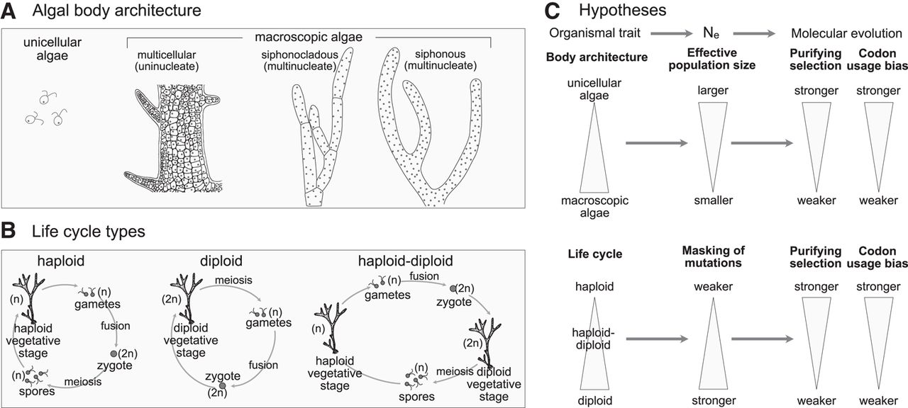 Variation in algal body architecture (A) and life cycles (B), as well as our working hypotheses of how these traits impact on molecular evolution (C). Reduced effective population sizes associated with increasing complexity of body architecture are likely to decrease the levels of purifying selection. For life cycles, haploid-dominant lineages are expected to have stronger selection than diploid-dominant lineages as a consequence of the masking of silenced mutations.