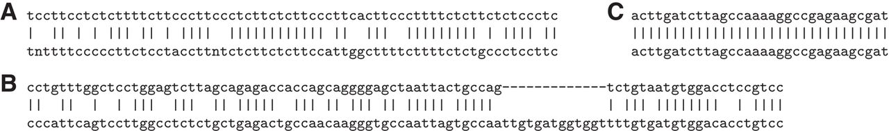 Alignments between parts of DNA sequences. (A) Reversed human Chromosome Y (upper) and UCON1 (lower). This is the highest-scoring alignment in the top-left panel of Figure 5. (B) Human Chromosome 6 (upper) and LFSINE_Vert (lower). (C) Human Chromosome 21 (upper) and human U2 (lower).