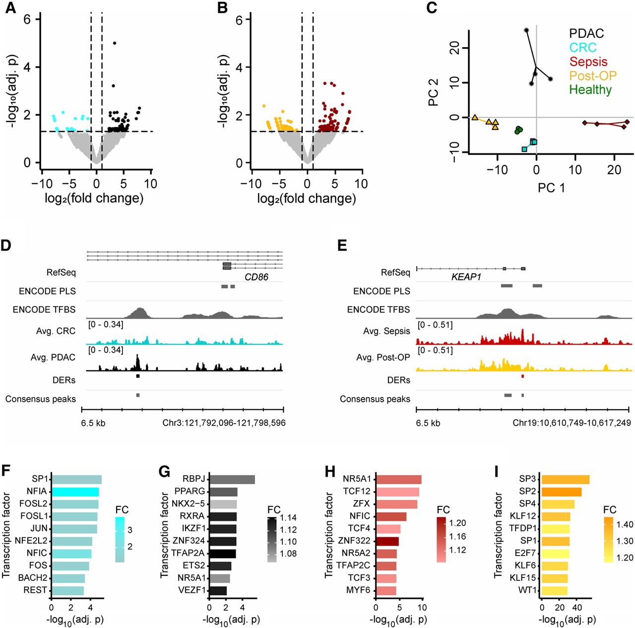 Comparison of short cfDNA data reveals condition-specific protection of TFBSs. (A) Differential enrichment analysis for pancreatic ductal adenocarcinoma (PDAC) samples with colorectal cancer (CRC) samples identifies differentially enriched TFBSs (Adj. P-value ≤ 0.05 and |log2(FC)| ≥ 1). (B) Differential enrichment analysis for sepsis samples with postoperative (Post-OP) samples identifies differentially enriched TFBSs (Adj. P-value ≤ 0.05 and |log2(FC)| ≥ 1). (C) Principal component analysis based on identified differential TFBSs separates all conditions and healthy individuals. Four biological replicates were used per condition. In addition to the samples, a centroid for each group is depicted as a larger data point. Variance explained: PC1 = 29.6%, PC2 = 20.9%. (D) Example for a differentially enriched TFBS in PDAC with novel TF binding near the alternative transcription start site of CD86. (E) Example for a differentially enriched TFBS in sepsis with novel TF binding in the promoter of KEAP1. (F–I) Top 10 differentially enriched TF motifs. (F) CRC consensus peaks in comparison to PDAC consensus peaks. CTCF and CTCFL were identified as well but were not included in the figure. (G) PDAC consensus peaks in comparison to CRC consensus peaks. (H) Sepsis consensus peaks in comparison to Post-OP consensus peaks. (I) Post-OP consensus peaks in comparison to sepsis consensus peaks. CTCF and CTCFL were identified as well but were not included in the figure.