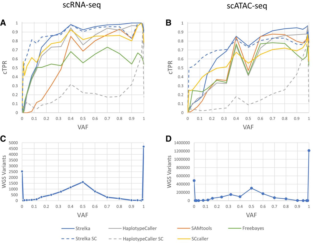 Common true-positive rate (cTPR) averaged over samples for different variant-calling approaches, for scRNA-seq (A) and scATAC-seq (B), binned by VAF (e.g., the point VAF = 0.5 would include variants from 0.5 to the next bin, which is 0.6). The number of WGS variants with coverage in the single-cell sequencing modality, for scRNA-seq (C) and scATAC-seq (D), binned by VAF.