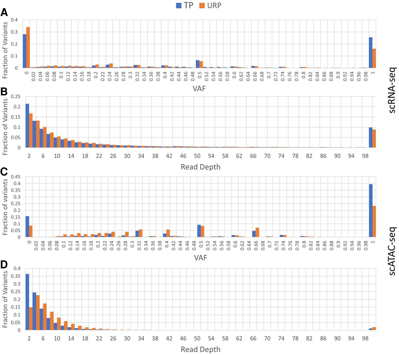 Comparing the composition of URP and TP variants by VAF and read depth for scRNA-seq (A,B) and scATAC-seq (C,D). The number of variants with a read depth of more than 100 are summed in the rightmost bin.