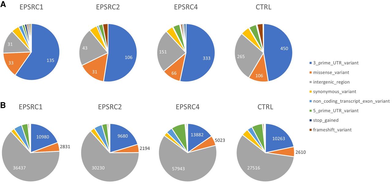 Breakdown of variant annotations for scu-variants (A) and rare positive variants (B) derived from scRNA-seq for each sample.