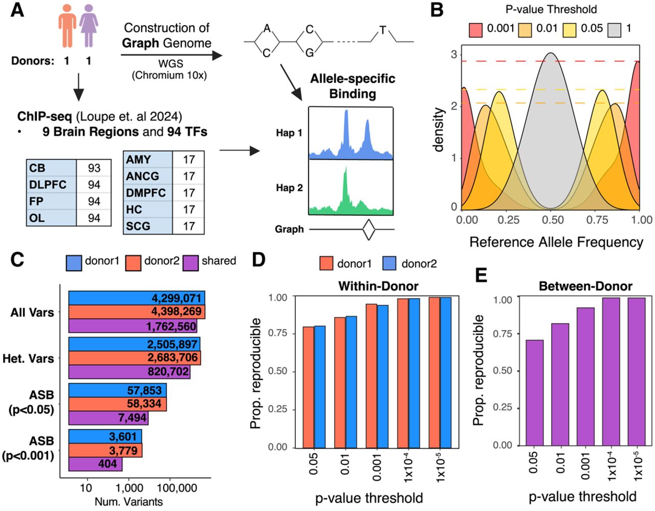 Overview of experimental design and allele-specific binding (ASB). (A) Workflow for detection of ASB. Whole-genome sequencing and ChIP-seq of 94 TFs were performed in postmortem brain samples from two donors. ChIP-seq reads were mapped to personalized graph genomes and tested for ASB across donors and tissues. Abbreviations denote the following: (DLPFC) dorsolateral prefrontal cortex, (FP) frontal pole, (OL) occipital lobe, (CB) cerebellum, (AnCg) anterior cingulate, (SCg) subgenual cingulate, (DMPFC) dorsomedial prefrontal cortex, (Amy) amygdala, and (HC) hippocampus. (B) Density plot showing the distribution of reference allele frequency at heterozygous variants for different P-value thresholds. (C) The number of total phased variants, heterozygous variants, significant variants (P < 0.05), and significant variants (P < 0.001) for both donors. “Shared” indicates variants that are shared and pass filters in both donors. (D) Within-donor reproducibility. The fraction of ASB events that preferred the same allele across brain regions at increasing P-value threshold. (E) Between-donor reproducibility. The fraction of ASB events that favored the same allele when comparing the same TF–allele interaction between donors.