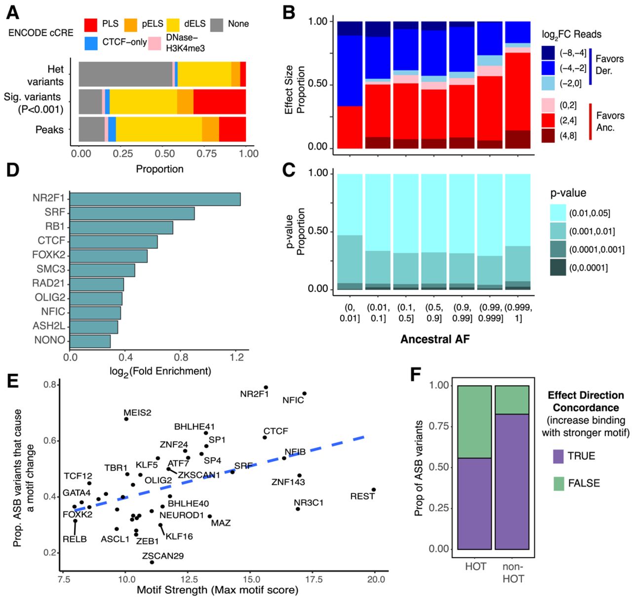 Genetic and genomic properties of ASB variants. (A) Stacked bar plots showing the fraction of regions which overlap a particular cCRE annotation for all heterozygous variants (top), ASB variants (middle), and all TF peaks (bottom). Red indicates promoter-like signal (PLS); orange, proximal enhancer-like signal (pELS); yellow, distal enhancer-like signal (dELS); blue, CTCF-only; pink, DNase-H3K4me3; and gray, non-cCRE regions. (B) Bar plot showing the proportion of ASB variants (P < 0.001) favoring the ancestral and derived allele and the degree of the allele preference [log2(Anc. count + 1/Der. count + 1)] for varying ranges of AAF. (C) For varying ranges of AAF (x-axis), we show the fraction of ASB variants found in each P-value range (y-axis). (D) The log2 fold enrichment (FE) for variants with a GERP-score > 4. The background for each TF is the nonsignificant heterozygous variants with a read depth greater than 11 for the corresponding TF. Only TFs with a chi-squared P-value < 0.01 are shown. (E) For each TF, the proportion of ASB variants that significantly alter a JASPAR motif (motifbreakR P-value < 0.0001) versus the maximum motif score for the PFM. Dashed line indicates the best fit line. (F) The proportion of ASB events that agree with the direction of the motif change in HOT sites versus non-HOT sites.