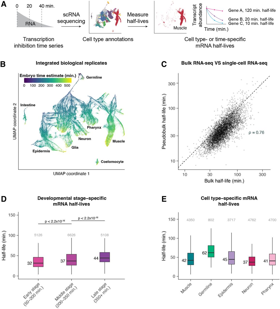 Single-cell RNA sequencing allows measurement of mRNA half-lives at high resolution throughout C. elegans embryogenesis. (A) A schematic representation of the approach to measure mRNA half-lives in the C. elegans embryo using transcription inhibition and single-cell RNA sequencing. (B) UMAP projection of the integrated data set of three biological replicates. Cells are colored by the age of the embryo from which a cell was produced, estimated from correlations to a whole-embryo RNA sequencing time series (Hashimshony et al. 2015). Trajectories corresponding to major cell types are labeled. (C) Scatter plot comparing the mRNA half-lives calculated in pseudobulk from the single-cell data and the half-lives calculated from the bulk-cell data on a log-log scale. Spearman's correlation coefficient = 0.76. Dashed line is the x = y line. (D) Box plots showing the stage-specific mRNA half-life distributions of genes within early-, middle-, and late-stage cells (50–200, 200–350, and 350+ min after the four-cell embryo stage, respectively). (E) Box plots showing the cell type–specific mRNA half-life distributions of genes within muscle, germline, epidermis, neuron, and pharynx. Numbers to the left of the box plots are median half-lives within each group. Numbers above the box plots are the number of genes within each group. P-values comparing median half-lives were calculated using the Wilcoxon rank-sum test. Outliers are not shown: From left to right for D, 203, 345, and 323 genes within each group had mRNA half-lives >100 min; from left to right for E, 141, 36, 150, 70, and 125 genes within each group had mRNA half-lives >150 min.