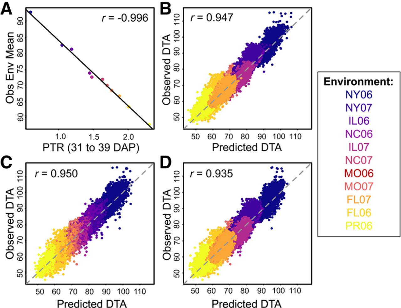 CERIS and prediction results for days to anthesis (DTA). (A) Identified environmental index of photothermal ratio (PTR) measured from 31 to 39 days after planting (DAP) is highly correlated with the observed environmental mean (Obs Env Mean). Representative examples of one-to-two prediction (B), one-to-three prediction (C), and one-to-four prediction (D).