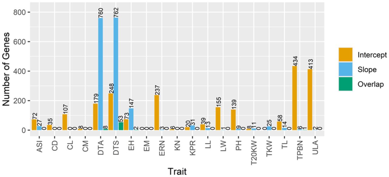 The number of candidate genes for each trait shows the varying genetic architectures of plasticity across traits. Candidate genes were identified as those within a 20 kb window surrounding each significant marker. All genes identified for intercept are shown in orange, all identified for slope are shown in blue, and the genes found in both the slope and intercept GWASs are shown in green.
