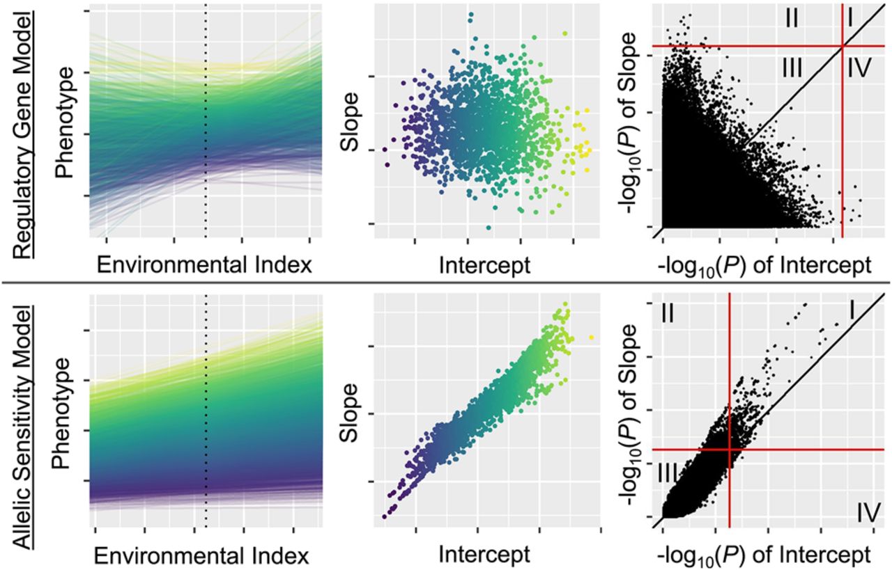 Conceptual visualization of two extreme cases along a continuum of genetic architecture of phenotypic plasticity: examples of a trait entirely following the regulatory gene model (top) and allelic sensitivity model (bottom) of phenotypic plasticity. (Left column) Reaction norms of phenotype across the environmental index; each line represents a single genotype, colored by genotypic mean (intercept). Dashed line indicates where the genotypic mean (intercept) is measured: the mean environmental index value across observed environments. (Middle column) Slope versus intercept values from these reaction norms; each point represents a single genotype, colored by genotypic mean (intercept). (Right column) −log10(P)-values from GWAS of slope (y-axis) and intercept (x-axis). Red lines show GWAS significance threshold, and the black line is x = y; quadrants I–IV are labeled.