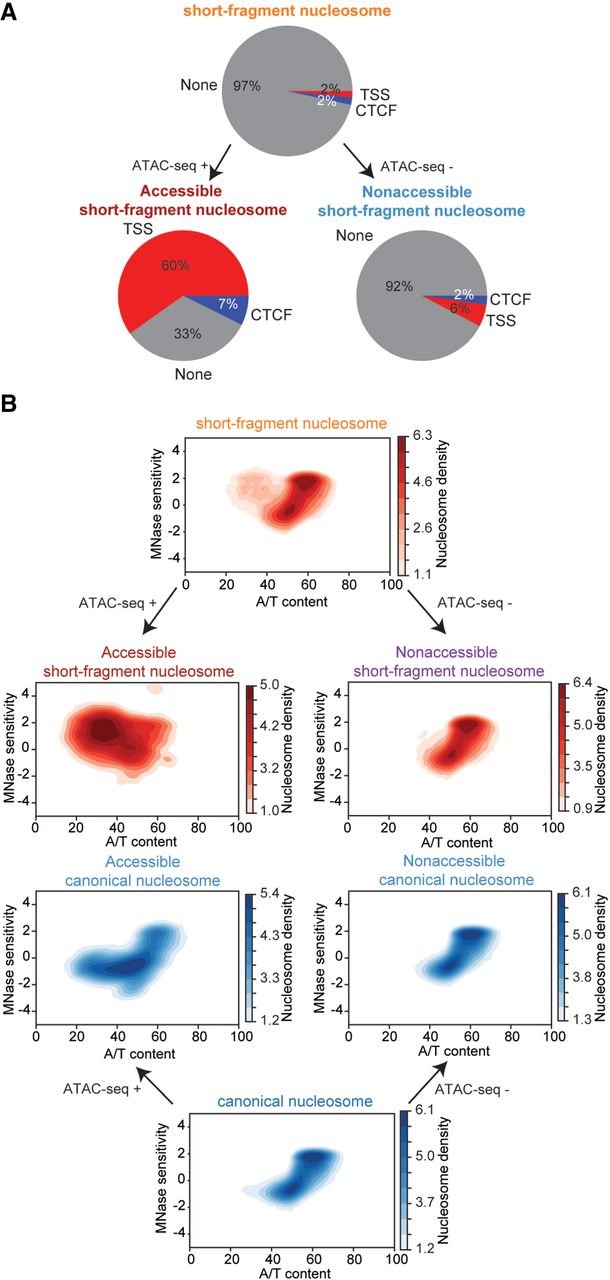 Subcategorization of SEM nucleosome subtypes reveals a population of accessible short-fragment nucleosomes. (A) Percentages of short-fragment nucleosome subtype and subcategories located at TSS regions (±500 bp) and CTCF binding sites. (B) 2D density plots show the relationships between A/T content and MNase sensitivity of each nucleosome subtype and subcategory; color bars indicate the log density of nucleosomes. Nucleosome subcategories were obtained by examining if the nucleosome is fully overlapped by ATAC-seq peak (ATAC-seq +) or not (ATAC-seq –).